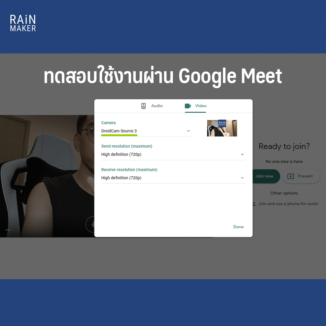 ลองทดสอบใช้กล้องกับโปรแกรมวิดีโอคอลดู สำหรับ Google Meet บนบราวเซอร์ก็สามารถเลือก Camera เป็น DroidCam Source 3 ได้ทันที เป็นอันจบการตั้งค่าใช้งาน ซึ่งถ้าใครอยากใช้ยาวๆ เราแนะนำให้มีขาตั้งหนีบมือถือง่ายๆ เพื่อปรับมุมกล้องให้ดีด้วยนะครับ