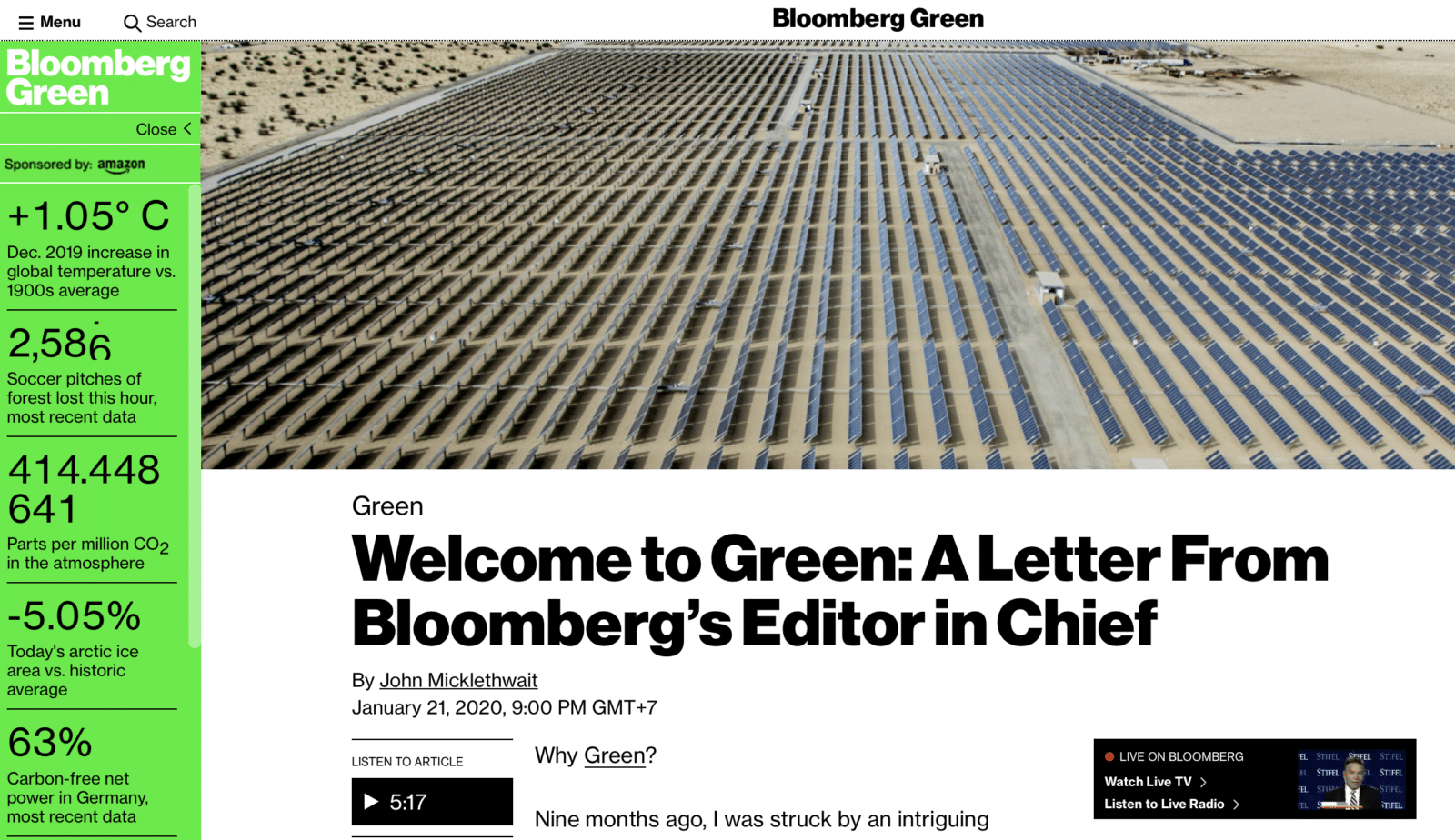 แม้กระทั่ง Publisher ในฝั่งธุรกิจอย่าง Bloomberg ยังออกมาทำ Bloomberg Green ซึ่งเป็นหน้าสำหรับติดตามข่าวสารเรื่องของความยั่งยืน และสภาพแวดล้อม ซึ่งก็มี Dashboard สำหรับสรุปสถิติข้อมูลของโลกเราตอนนี้