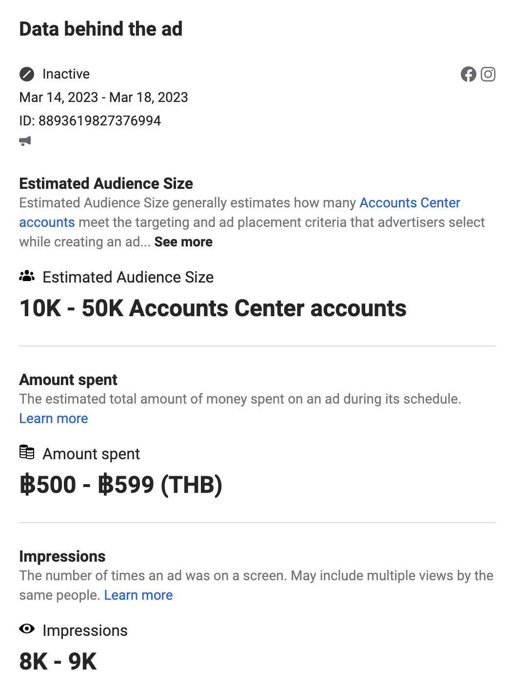 เช็กได้ทั้งการแอ็กทีฟ หรือไม่แอ็กทีฟของโฆษณา วันที่ลงโฆษณา แพลตฟอร์มที่ลงโฆษณา (มีทั้ง Facebook และ Instagram) และคนที่เป็นสปอนเซอร์โฆษณา หรือแม้แต่ยอดคนมองเห็นโฆษณา (Impressions) ก็แสดงข้อมูล ได้พร้อมเก็บข้อมูลย้อนหลังสูงสุด 7 ปี