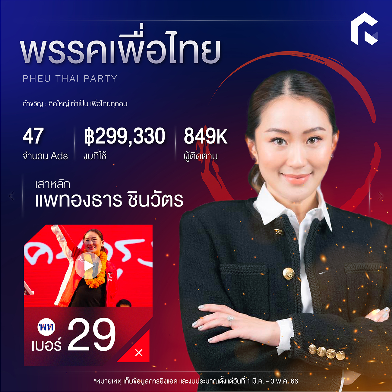 ซึ่งใช้งบประมาณในการยิงโฆษณาพรรคเพื่อให้คนมองเห็นไป 299,330 บาท กับจำนวนโฆษณา 47 ตัว ถึงแม้จะมีแค่หลักสิบ แต่ก็น่าจะมัดใจชาวแลนด์สไลด์ได้ เพราะเพื่อไทยเชื่อว่า “ความอยู่ได้ของคุณอุ๊งอิ๊งค์อยู่ที่ศรัทธาประชาชน”