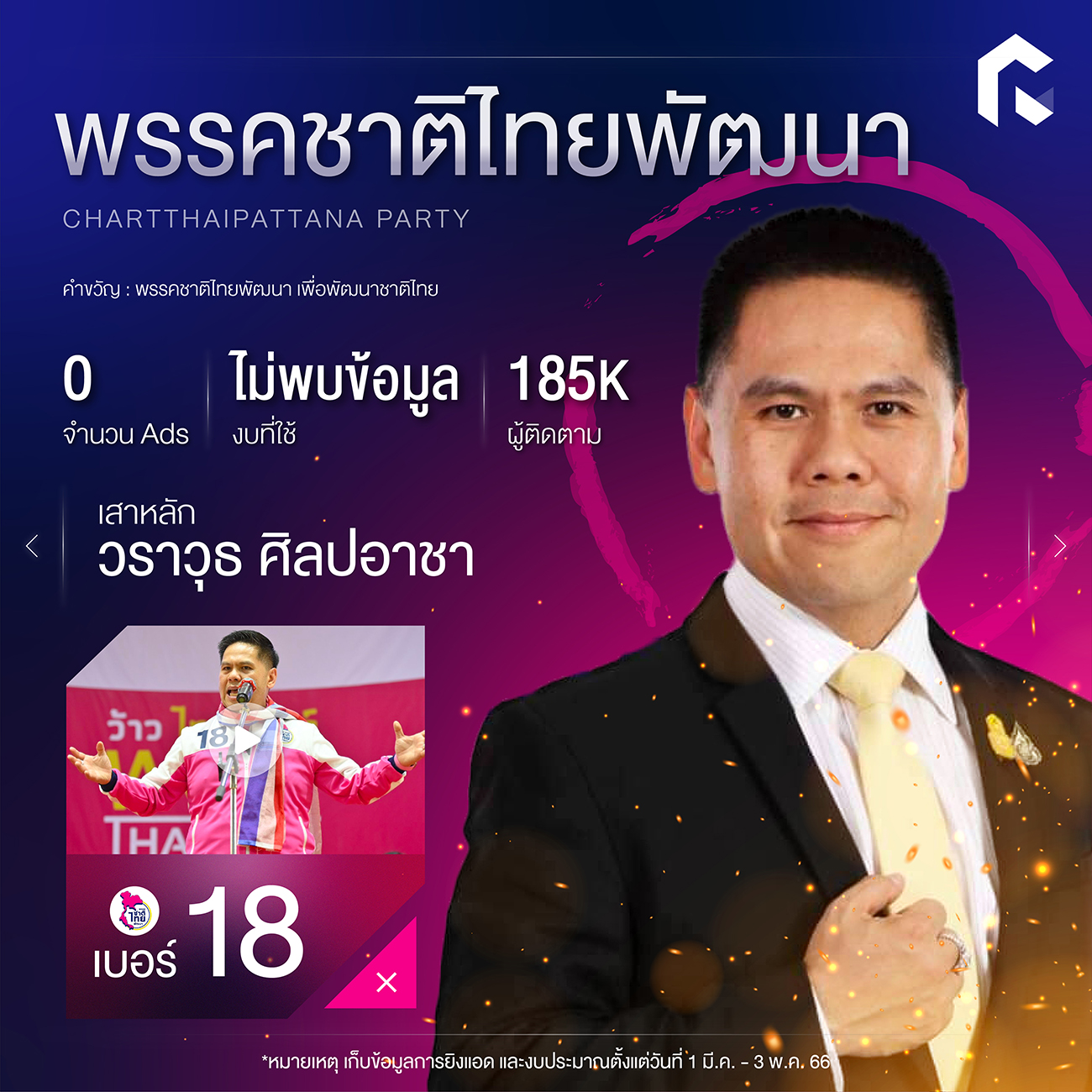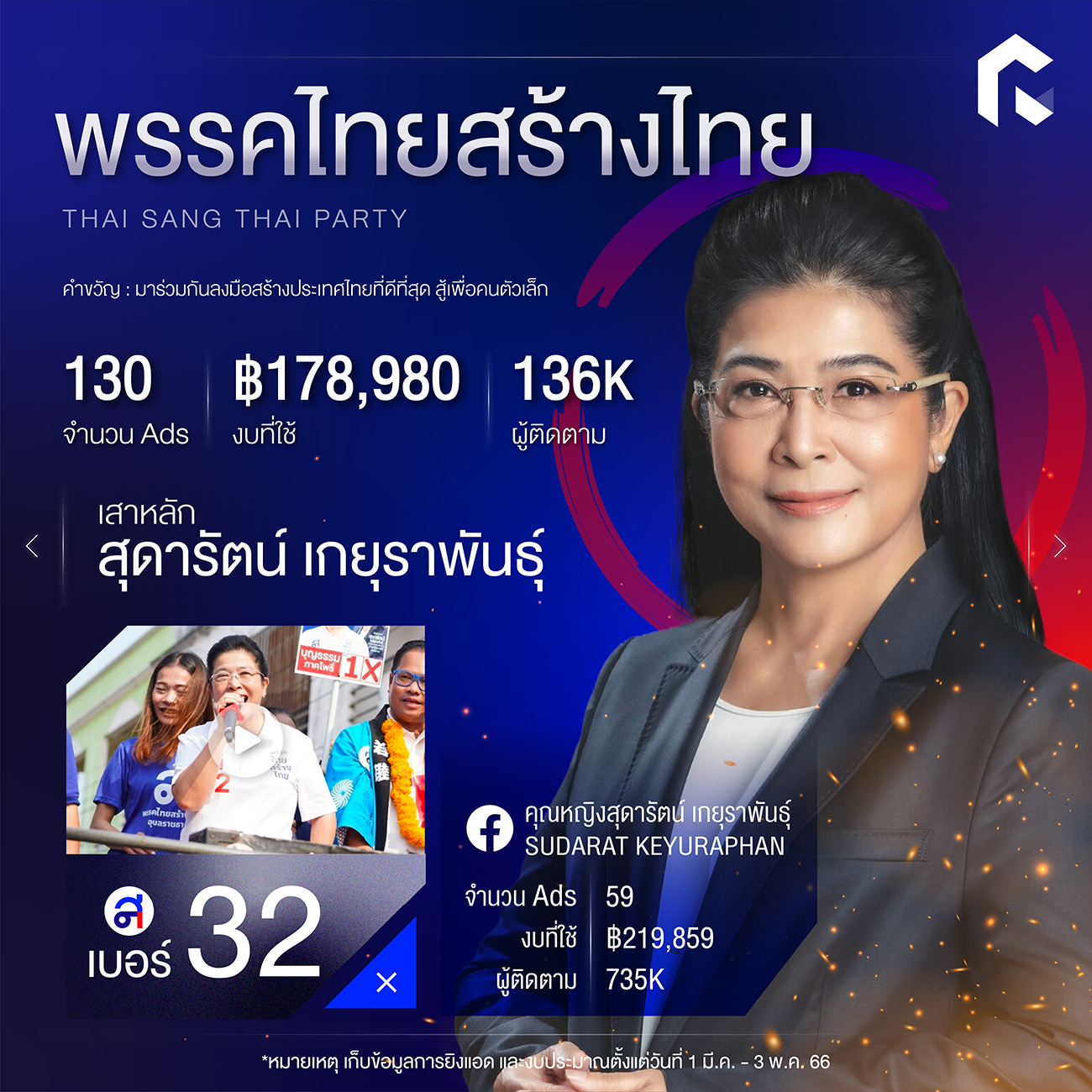 ซึ่งใช้งบการยิงแอดของพรรคไป 178,980 บาท กับจำนวนโฆษณา 130 โพสต์ ส่วนโซเชียลของคุณหญิงสุดารัตน์ ก็มีการใช้งบยิงแอดไป 59 โพสต์ เป็นจำนวนเงิน 219,859 บาทเช่นกัน เพราะมีภาพจำส่งถึงประชาชนมากกว่าพรรคนั่นเอง