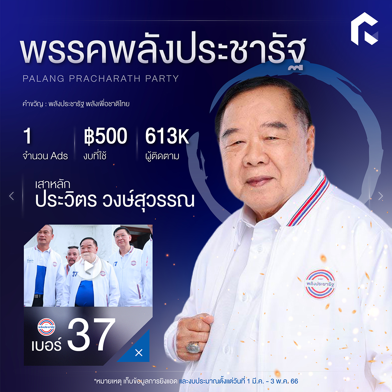 โดยพรรคพลังประชารัฐมีการใช้งบยิงแอดไปเพียง 500 บาทเท่านั้น กับโฆษณาจำนวน 1 โพสต์ ซึ่งแม้จะไม่ได้เป็นจำนวนที่เยอะมากนัก แต่พรรคก็เชื่อว่านโยบายจากคนคุ้นเคยอย่างลุงป้อมจะ “ขจัดทุกปัญหา พัฒนาทุกพื้นที่” เพื่อคุณภาพชีวิตที่ดีกว่าเดิมได้