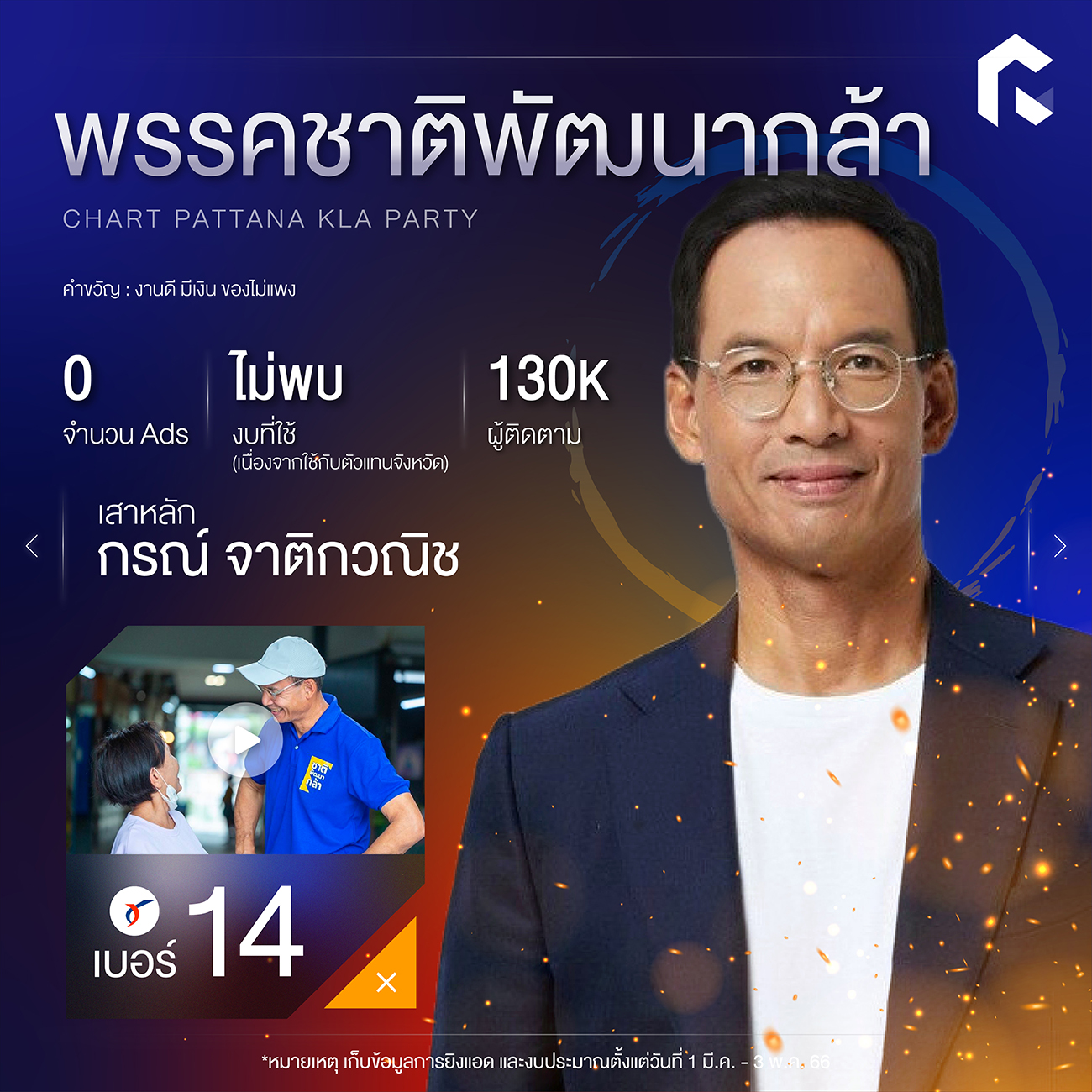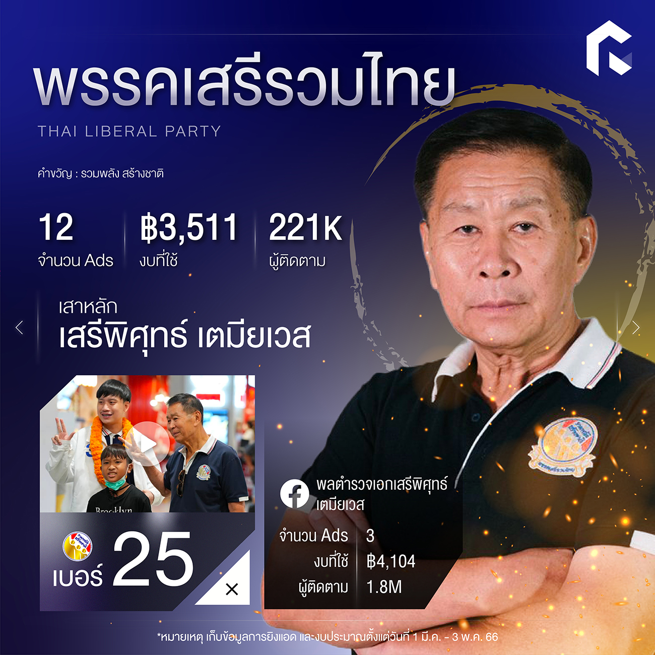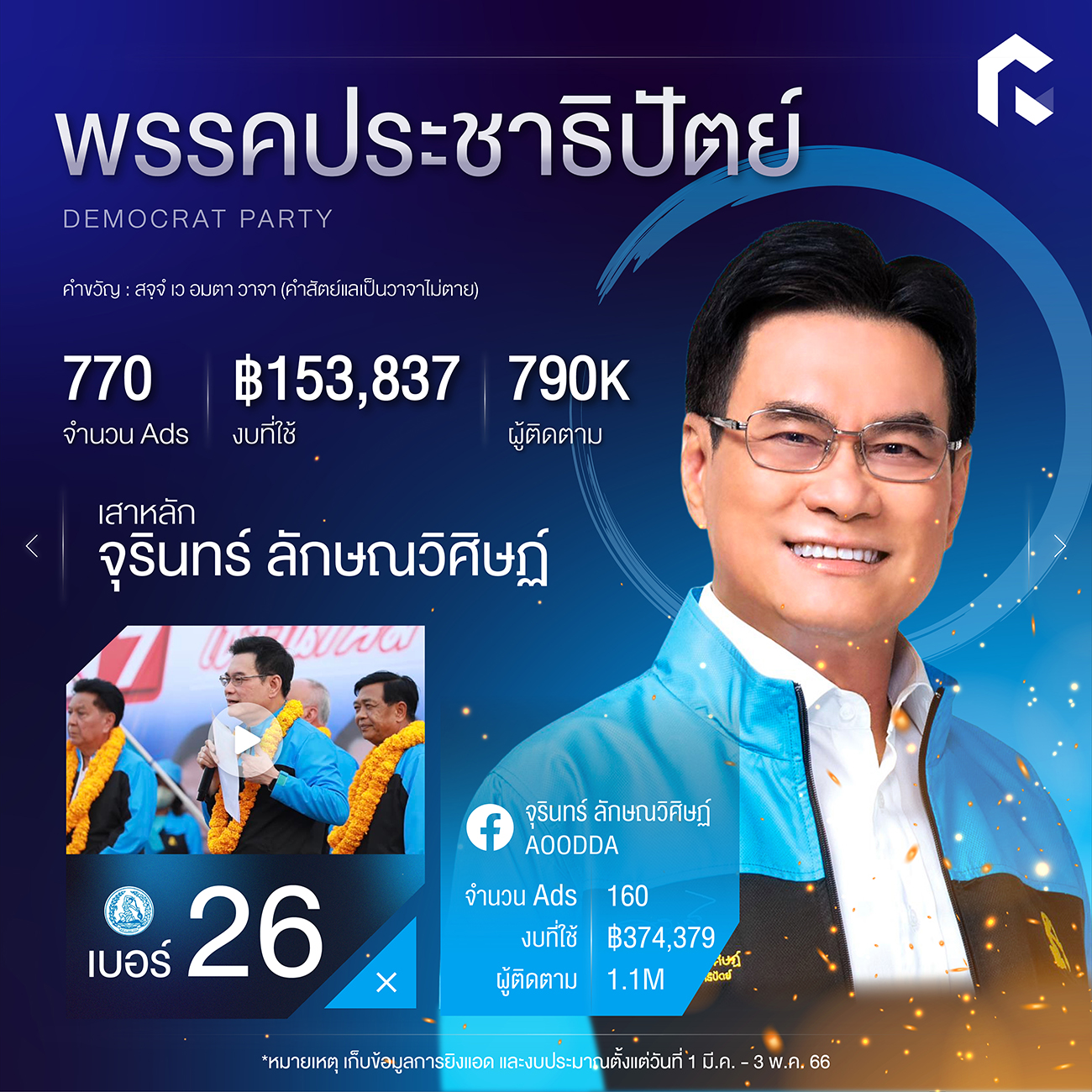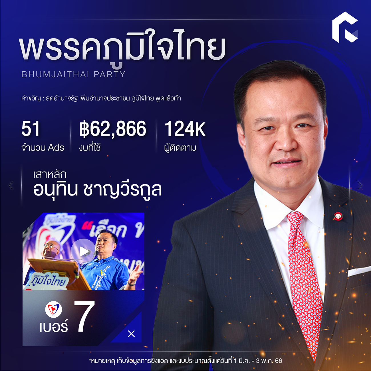 เหลือเวลาอีกเพียงแค่ 2 วันก่อนจะถึงวันเลือกตั้งล่วงหน้าอาทิตย์ที่ 7 พฤษภาคม และเลือกตั้งรอบทั่วไปในวันอาทิตย์ที่ 14 พฤษภาคมนี้ ทาง RAiNMaker เลยพามาส่องการบูสต์โพสต์ ยิงโฆษณาบน Facebook ของแต่ละพรรคกัน โดยทำการสำรวจเมื่อวันที่ 1 มีนาคม – 3 พฤษภาคม 2566 ที่ผ่านมา