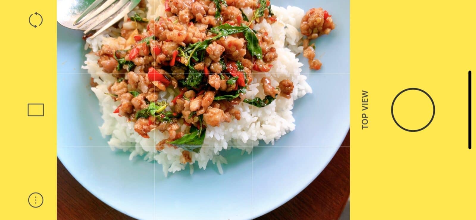 ภาพ Top View เรียกว่าเป็นมุมบังคับของการถ่ายภาพอาหารเลยทีเดียว ที่ทำให้เห็นภาพกว้าง พร้อมกับท็อปปิ้งต่างๆ ที่อยู่บนจานอาหารจะโดดเด่นขึ้น เมื่อเราถ่ายภาพ Top View ผ่าน Foodie ตัวแอปฯ จะบอกให้เราทราบทันทีว่ามุมที่เราเล็งอยู่นั้นเป็น Top View ด้วยการขึ้นกรอบสีเหลืองขณะถ่ายภาพ