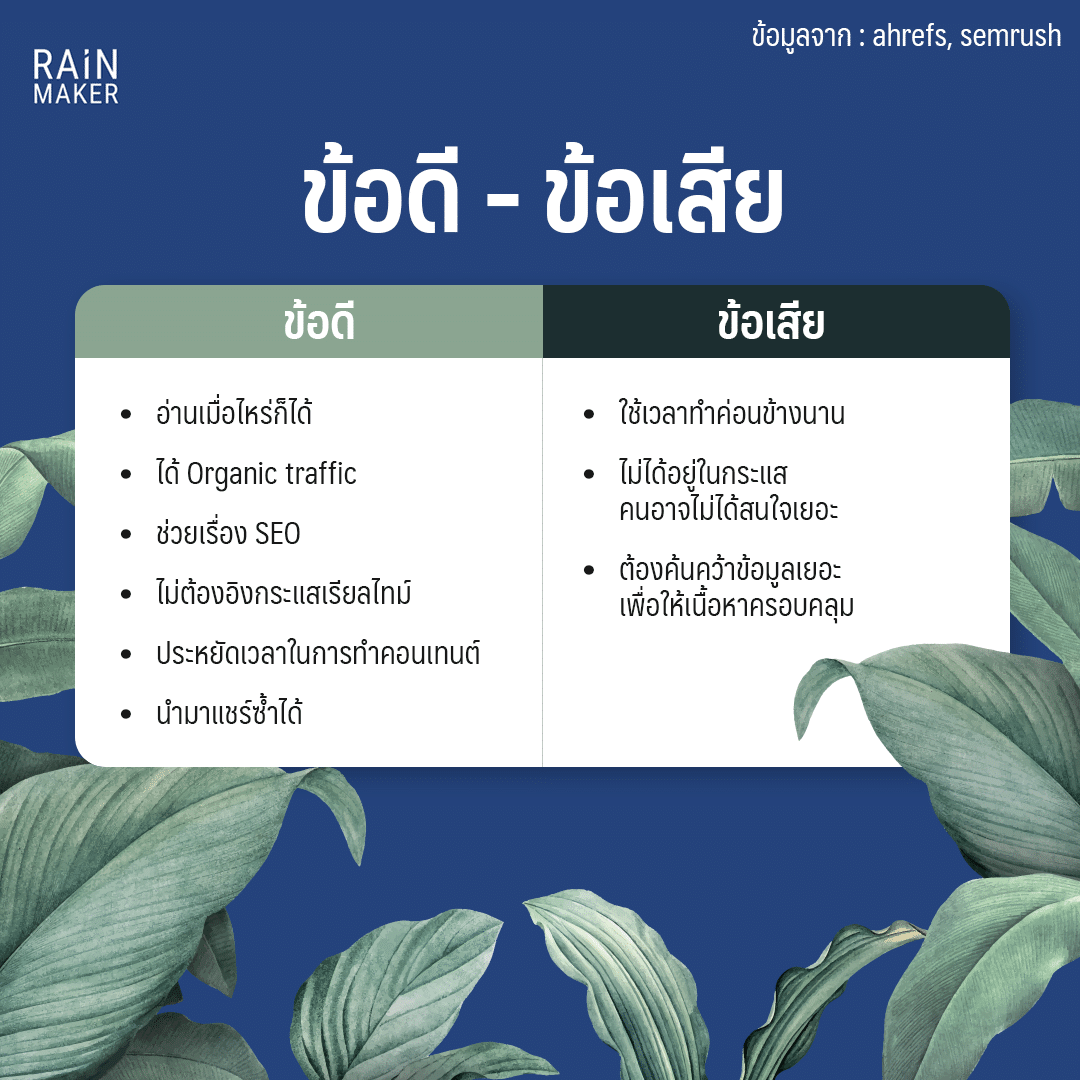 - ต้องใช้เวลาทำค่อนข้างนาน เนื่องจากต้องรีเสิร์ชข้อมูลเยอะ เพื่อให้เนื้อหามีความครอบคลุม และเป็นคอนเทนต์ที่ไม่ตาย