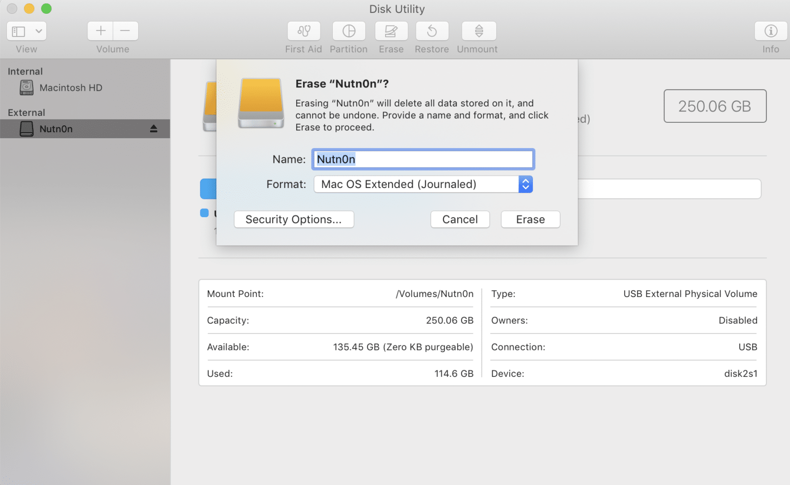 • วิธีการคือให้เสียบ SSD เข้ากับ Mac เปิดโปรแกรม Disk Utility แล้วไปที่ External SSD ของเรา เลือก Erase จากนั้นปรับ Format เป็น Apple File Syste หรือ Mac OS Extended