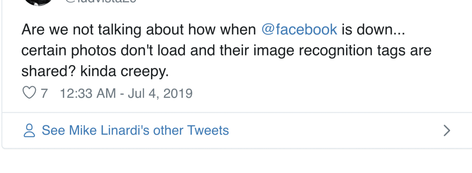 เมื่อวันที่ 4 กรกฎาคมที่ผ่านมาทั่วโลกก็ได้เจอกับวิกฤติ Facebook ล่มกันอย่างพร้อมหน้าเพราะเกิดจากระบบ CDN ซึ่งเป็น ซึ่งโดนด่าเรื่องล่มไม่พอแล้ว Facebook ยังโดนเล่นประเด็นเรื่องข้อความที่ปรากฎขึ้นตอนที่ภาพไม่โหลด ซึ่งเป็นคำบรรยายของภาพที่เกิดจากการนำโมเดล Machine Learning มาเดาว่าสิ่งที่อยู่ในภาพคืออะไร วัตถุ หรือคน แล้ววิเคราะห์ออกมาเป็นคำ ด้วยคำว่า Image may contain: