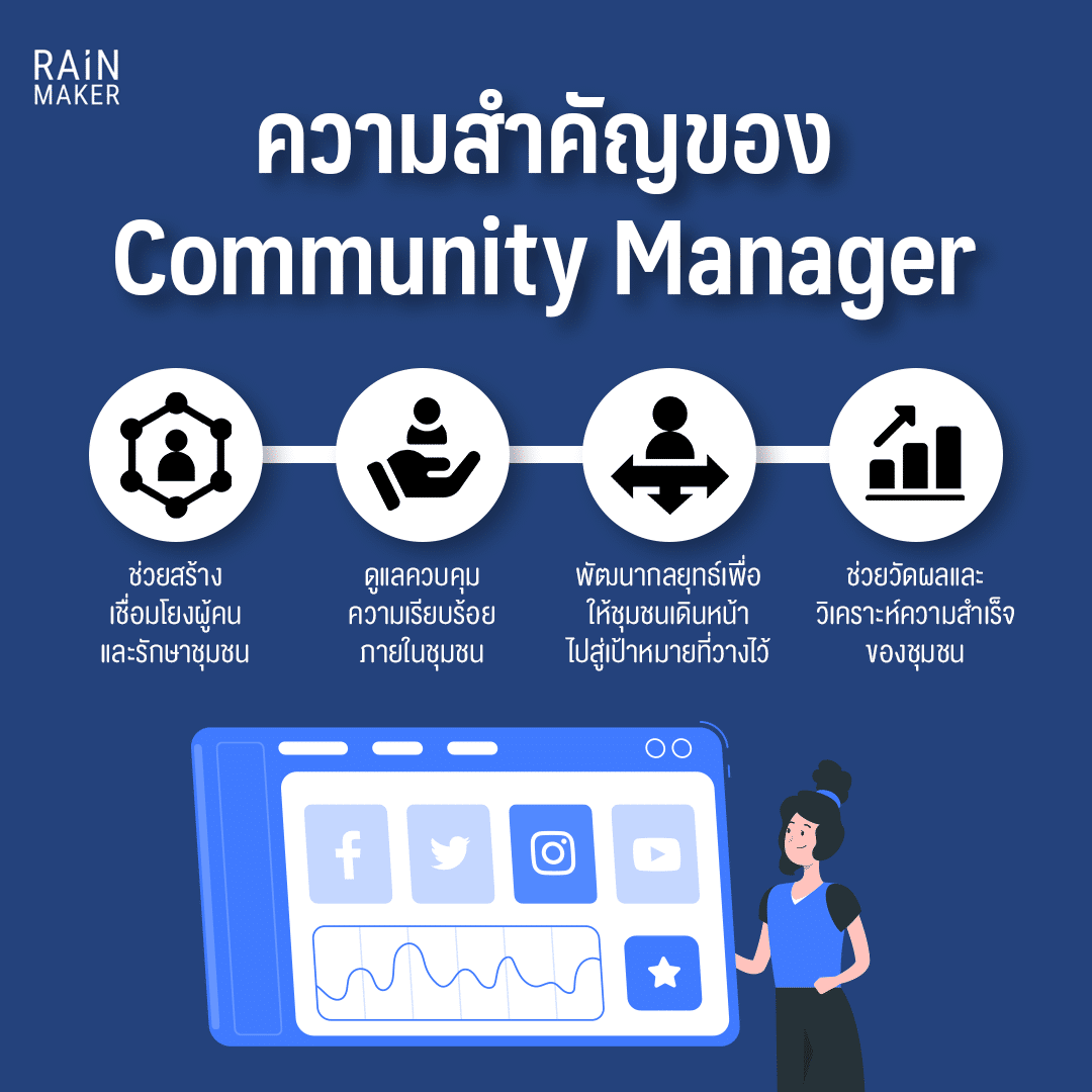 ทั้งนี้ก็เพื่อช่วยผลักดันชุมชนออนไลน์ซึ่งเป็นสถานที่ๆ ให้ผู้คนสามารถเชื่อมต่อถึงกัน เพื่อสร้างความรู้สึกถึงการมีส่วนร่วม และสื่อสารกับคนอื่นๆ ที่มีความสนใจในเรื่องเดียวกันได้ และสิ่งที่ขาดไม่ได้ในชุมชนเลยก็คือ ‘ผู้จัดการชุมชนออนไลน์’ หรือ Community Manager นั่นเองที่เป็นสิ่งสำคัญในการช่วยสร้าง และรักษาชุมชนเพื่อเชื่อมโยงผู้คนเข้าด้วยกัน คอยพัฒนากลยุทธ์เพื่อให้ชุมชนสามารถเดินหน้าไปสู่เป้าหมายที่วางไว้ และวัดผลความสำเร็จของชุมชน