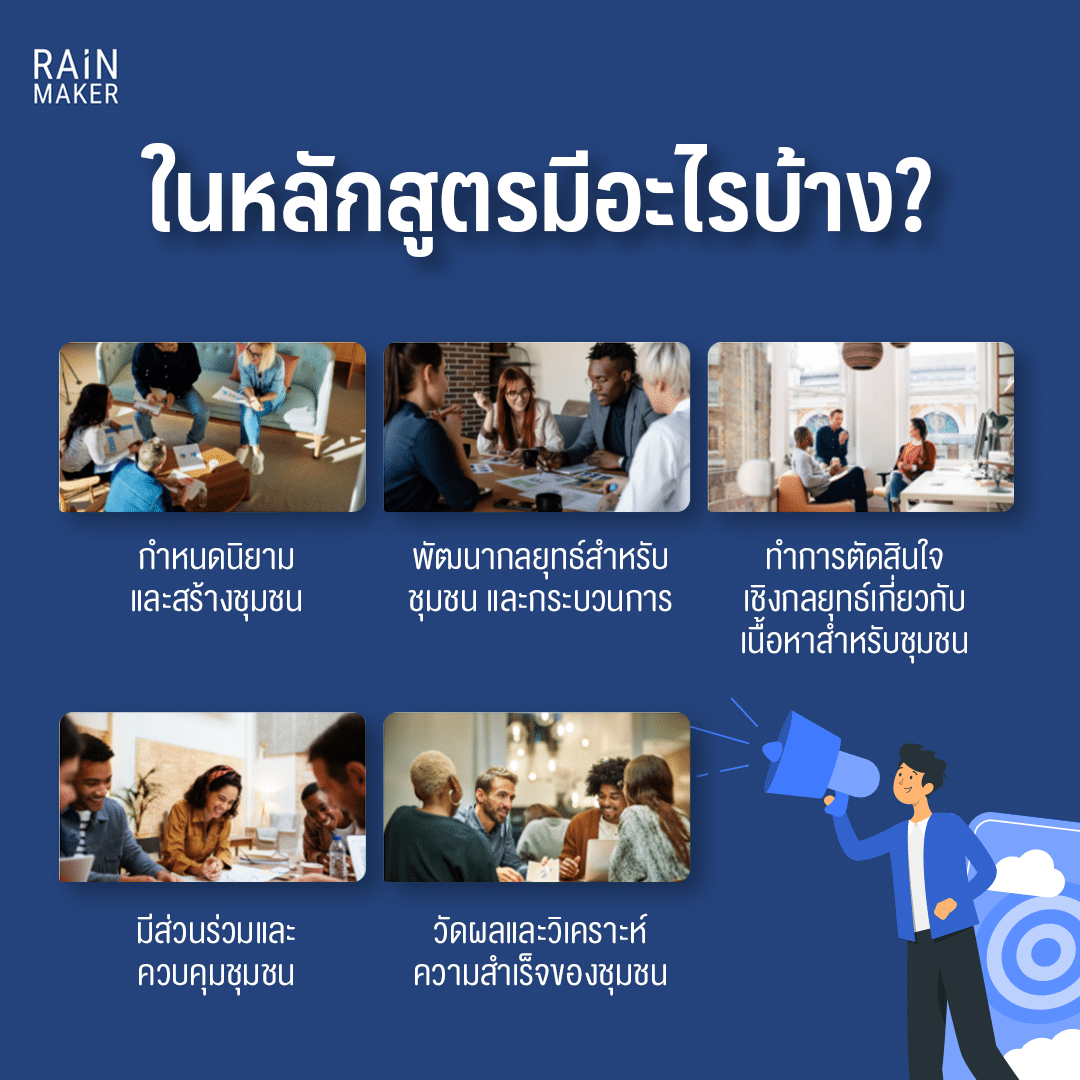 หลักสูตรจะครอบคลุมเกี่ยวกับกลยุทธ์ในการสร้างและดูแลชุมชนออนไลน์ ผู้เรียนจะได้เรียนรู้ทักษะในการควบคุม และกระตุ้นให้ผู้คนมีส่วนร่วมในชุมชน โดยหลักสูตรในแต่ละหัวข้อจะให้ความรู้ในแต่ละขั้นตอนและวัตถุประสงค์ที่แตกต่างกันไป ซึ่งสามารถนำไปประยุกต์ใช้กับชุมชนของตัวเองได้ รวมถึงสามารถดึงดูดความสนใจ ขยาย และรักษาชุมชนออนไลน์ให้เดินทางบรรลุเป้าหมายได้ในที่สุด