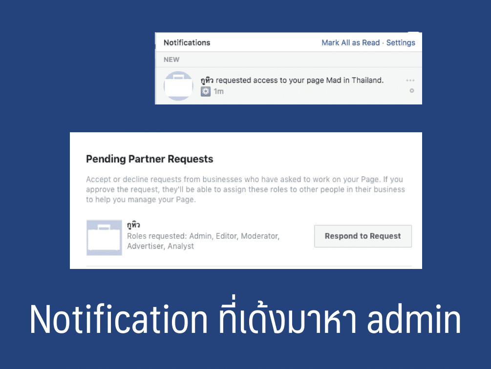 สิ่งที่แสดงให้ admin ตัวจริงเห็นคือภาพตามด้านบน ซึ่งเชื่อว่าหลายคนไม่ได้สังเกตว่าที่ request มาขอเป็น role อะไรบ้าง ตรงนี้ถ้ากดรับไป Business เจ้านั้นก็จะกลายเป็นเจ้าของเพจเราทันที