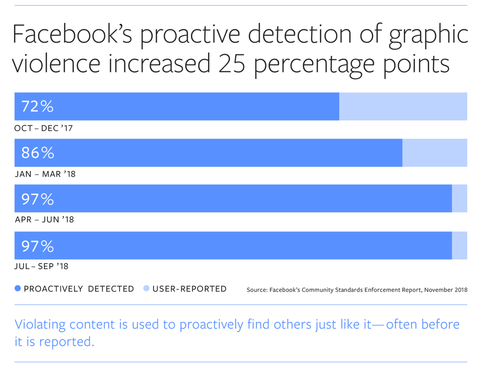 Facebook โชว์สถิติว่า ระบบการตรวจจับภาพที่มีความรุนแรงจากเดิมที่ทำงานได้ถึง 72% ในปีก่อน แต่ล่าสุดสามารถตรวจจับได้ถึง 97% มีเพียงแค่ 3% เท่านั้นที่เป็นการรายงานจากผู้ใช้งาน ในไตรมาสที่ 3 ของปี 2018 Facebook ลบภาพที่มีเนื้อหารุนแรงไปแล้วกว่า 15.4 ล้านคอนเทนต์