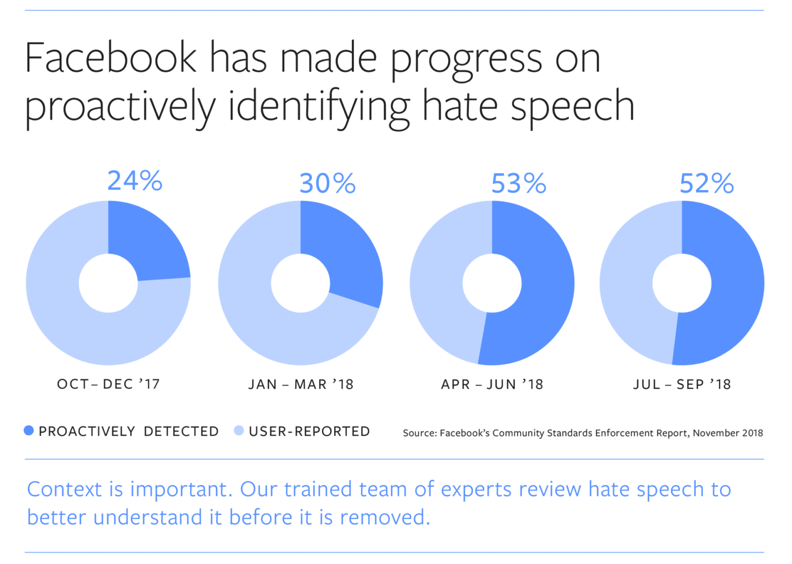 สถิติในการจัดการกับ Hate Speech นั้นน่าสนใจเลยทีเดียว Facebook บอกว่าในไตรมาสสุดท้ายของปี 2017 มี Hate speech ที่ถูกลบทั้งหมด 24% เท่านั้นที่เป็นผลงานของระบบอัตโนมัติ แต่สถิติการทำงานและการพัฒนาของ Machine Learning ก็ดีขึ้นอย่างมาก จนในไตรมมาสล่าสุดนี้ในปี 2018 ผลการทำงานของมันก็สามารถตรวจจับ Hate Speech กว่า 52% ของ Hate Speech ทั้งหมด เรียกได้ว่าแทบจะครึ่ง ๆ กับ user-reported แล้ว