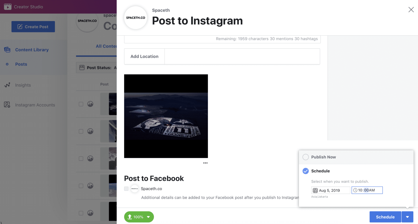 หลังจากนั้นให้เราอัพโหลดรูป และ Caption ที่เราต้องการ โดยสามารถใช่ # อะไรได้ตามปกติเลย และที่พิเศษก็คือเราสามารถตั้งเวลาลงรูปหรือ Schedule ตามที่เราต้องการได้ด้วย (ซึ่งอันนี้ใหม่มาก แม้กระทั่งฟีเจอร์ของแอพ Instagram เองยังไม่สามารถทำได้)