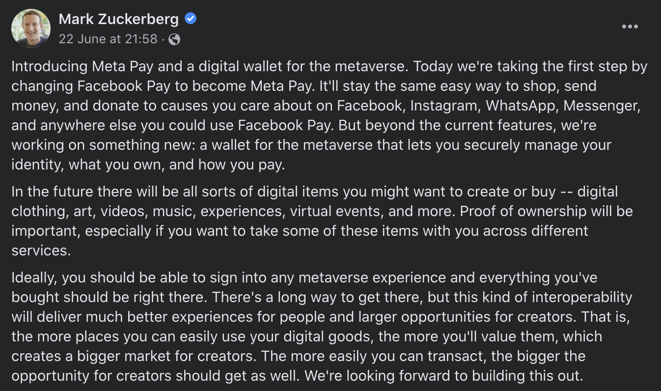แต่ Meta Pay จะยังคงให้บริการเหมือนกับ Facebook Pay แต่เพิ่มเติมคือ การรองรับการซื้อขายวัตถุดิจิทัลในอนาคตเข้าไปด้วย ไม่ว่าจะเป็น ไอเท็ม, เสื้อผ้าดิจิทัล, ศิลปะดิจิทัล, สื่อมีเดีย และเพลงบนโลกดิจิทัล ไปจนถึงอีเวนต์ หรือคอนเสิร์ตที่สร้างประสบการณ์ในโลกเสมือนต่าง ๆ ด้วย