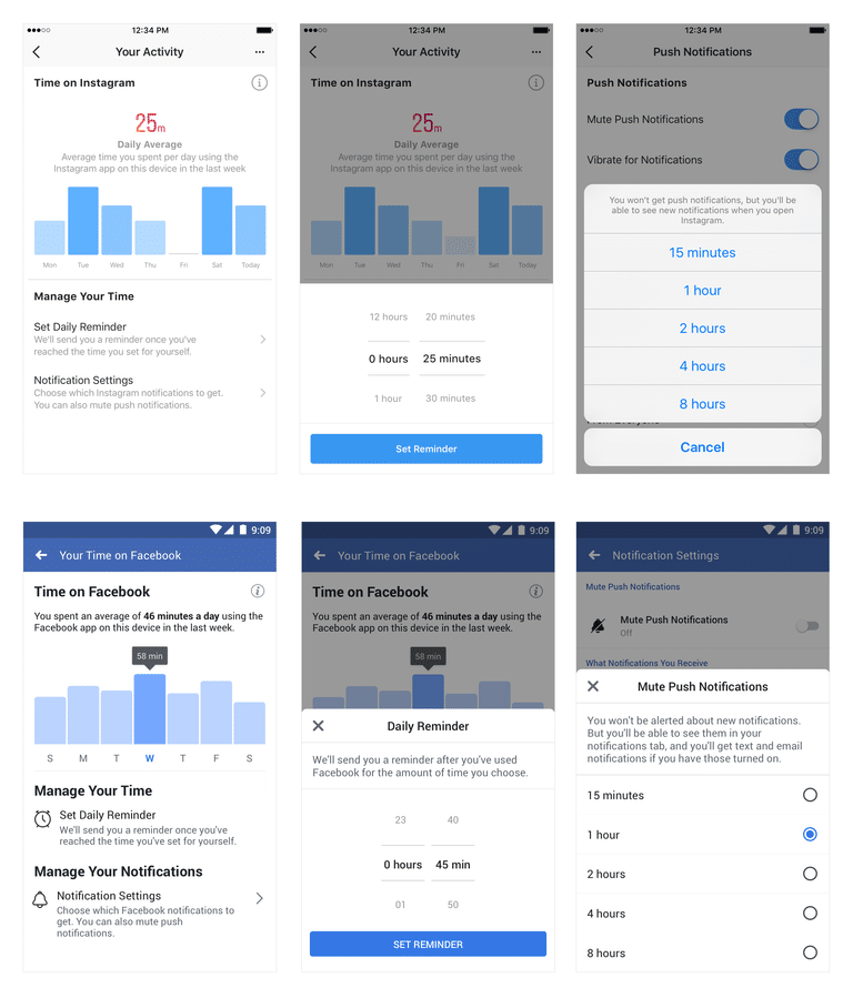• Facebook และ Instargram ออก Dashboard Manage Your Time : อยากรู้ว่าตัวเองติดโซเชี่ยลหนักแค่ไหนจะได้รู้กันแล้ว โดยหน้า Dashboard จะบอกหมดเลยว่าเราเล่นเฟส ไอจี ช่วงไหนบ้าง รวมแล้วต่อวันเป็นเวลากี่ชั่วโมง หากมากไปสามารถตั้งแจ้งเตือนได้ว่าได้เวลาวางมือถือในมือลงก่อน