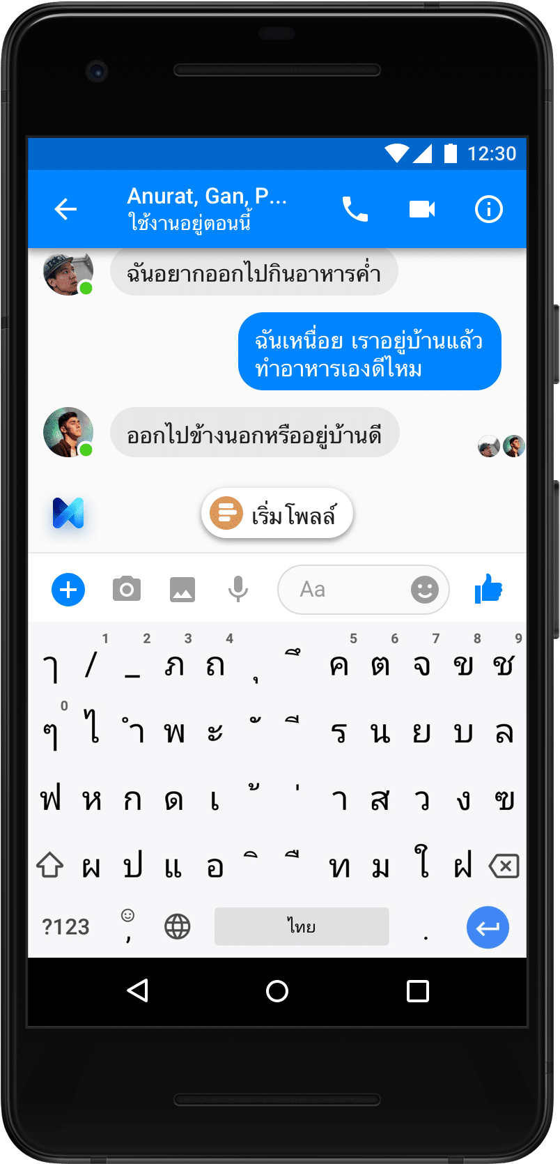 ในตอนนี้ผู้ใช้ในไทยสามารถใช้งาน M ได้แล้ว เพียงแค่คุยกับเพื่อนในแชทแบบเดี่ยวหรือแบบกลุ่มตามปกติ เมื่อมีบทสนทนาที่เกี่ยวข้อง โลโก้ M จะปรากฏขึ้นพร้อมคำแนะนำและทางเลือกต่าง ๆ