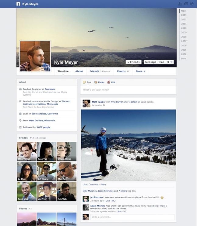 มีการแบ่ง Section ชัดเจนมากขึ้นกว่าเดิมและมี Cover Profile ให้ใส่ได้แล้วด้วย UI ต่างๆเริ่มเป็น Card Design แบบสมบูรณ์ และ Facebook Timeline ก็มีให้ใช้แล้ว
