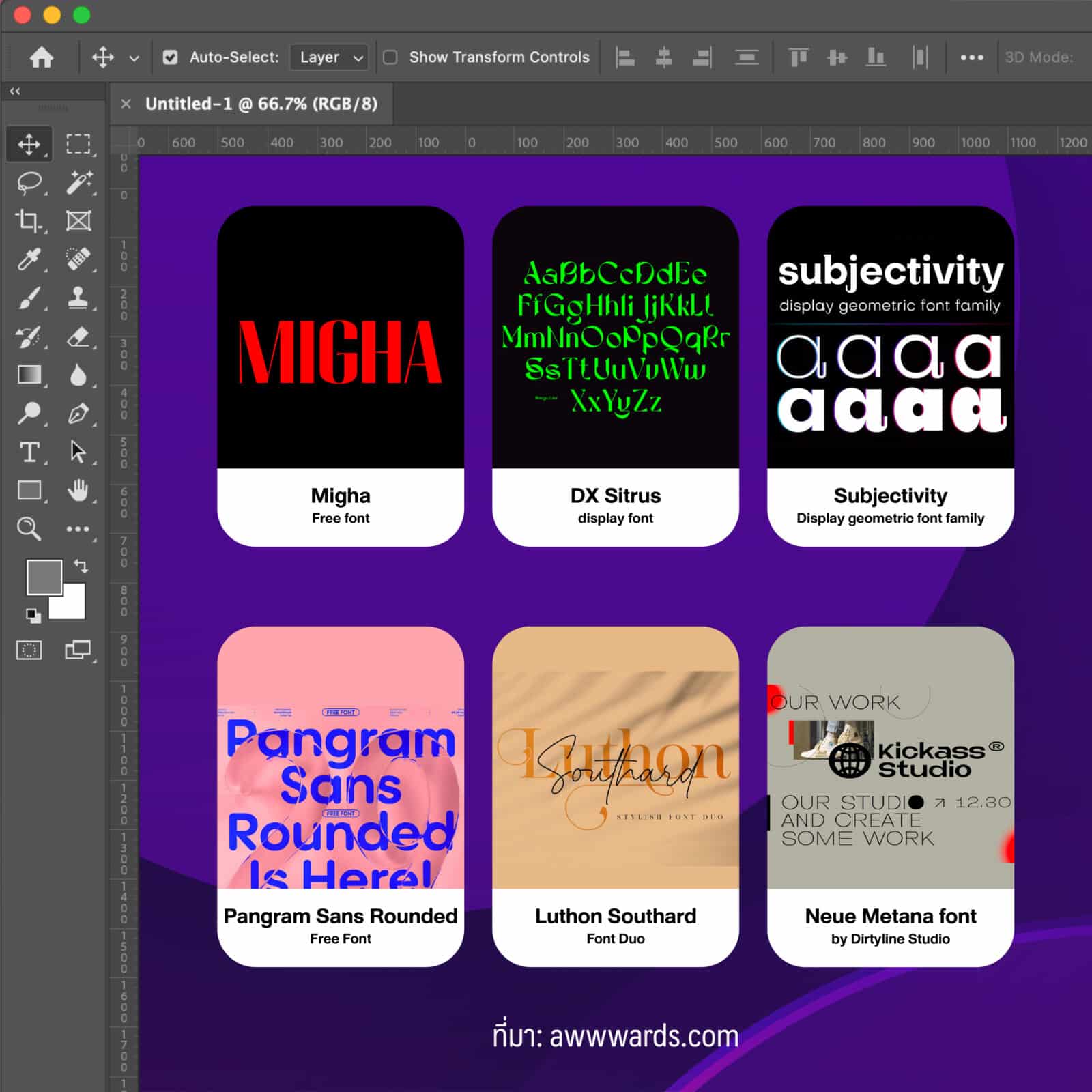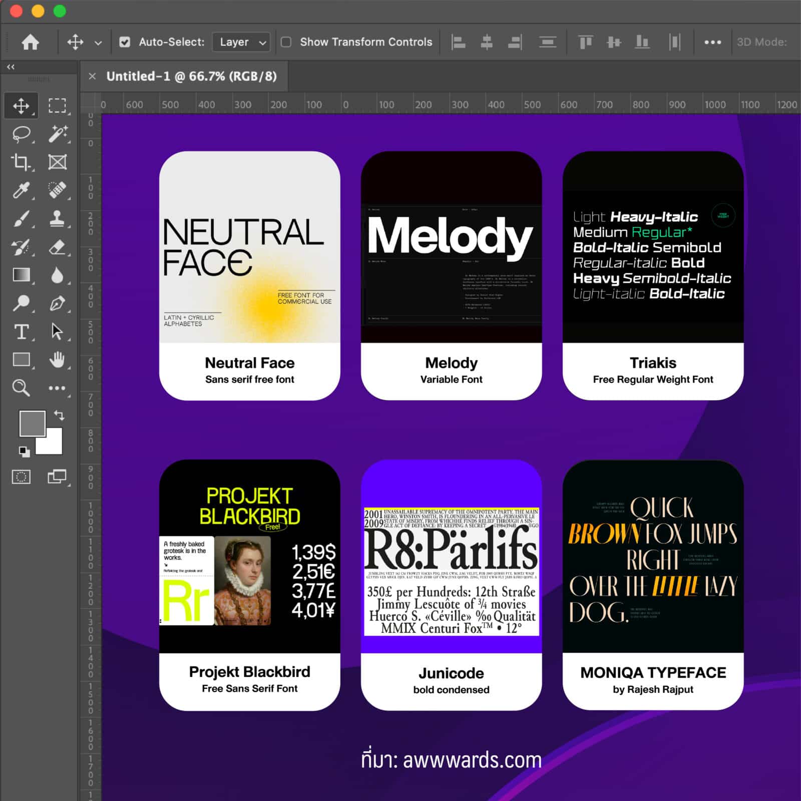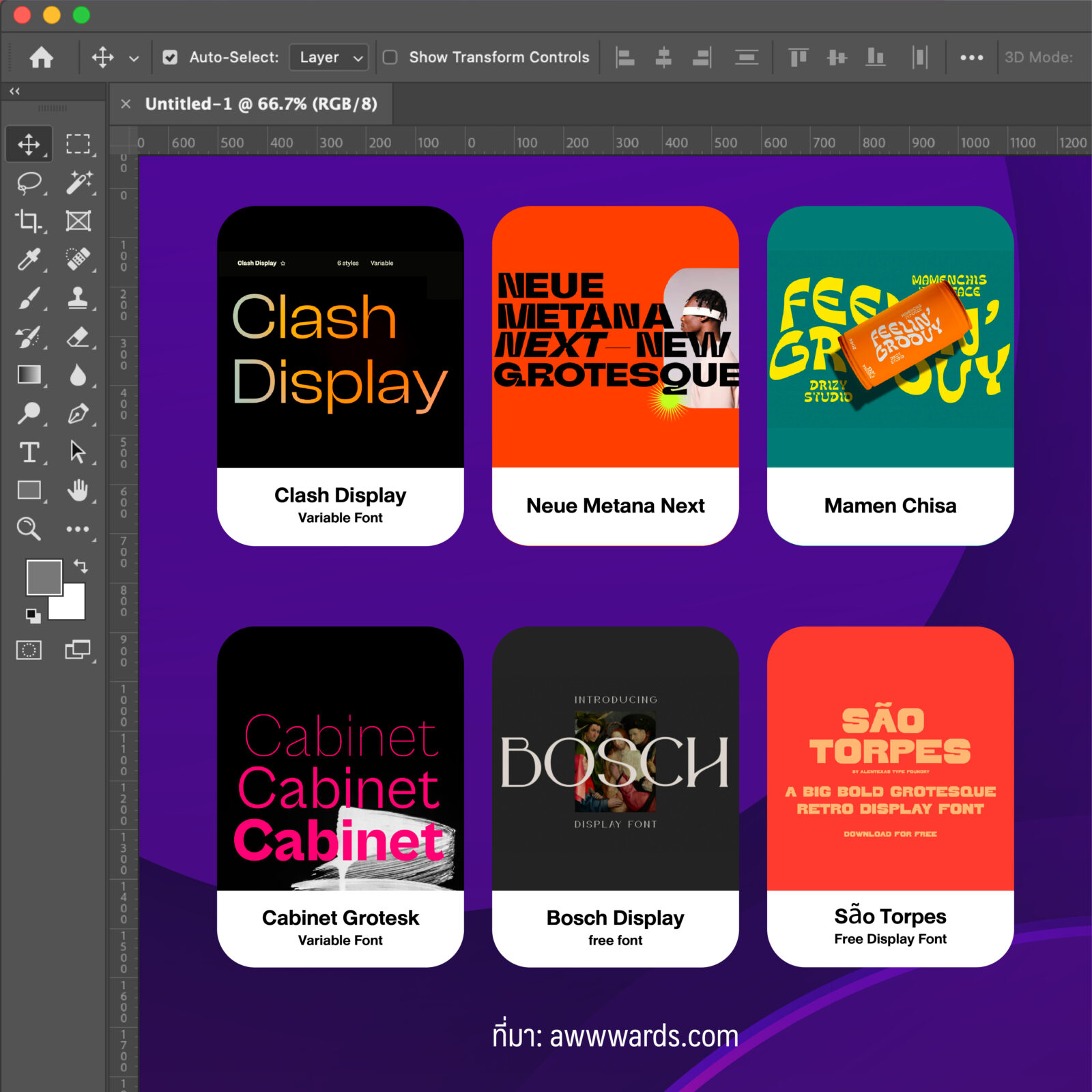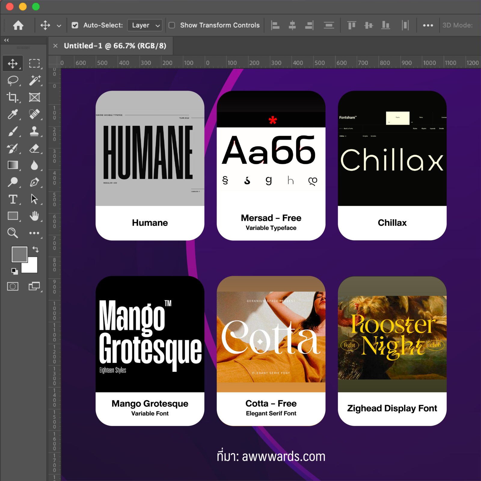 โดยฟอนต์เหล่านี้จะมาจาก awwwards จำนวน 100 ฟอนต์ ที่มีสไตล์การใช้งานให้นำไปใช้อย่างหลากหลาย เรียกได้ว่าเป็นฟอนต์ที่ถูกรวบรวมมาแล้วว่าเหมาะกับเทรนด์ในตอนนี้เป็นอย่างมาก