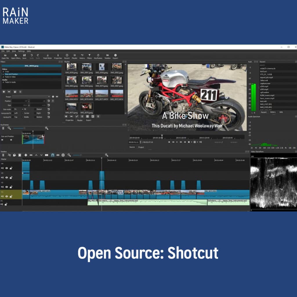 ในส่วนโปรแกรมแบบ Open Source โปรแกรมแรกที่จะพูดถึงเลยคือ Shotcut เป็นโปรแกรมที่ดีเลยทีเดียว สำหรับโปรแกรมฟรี เครื่องมือพื้นฐานสำหรับการตัดต่อมีมาให้หมด เช่น เสียง สี และเอฟเฟคต่างๆ จุดเด่นอีกอย่างคือสามารถใช้งานข้ามแพลตฟอร์มได้ ไม่ว่าจะเป็น Windows, Linux หรือ macOS ก็ตาม