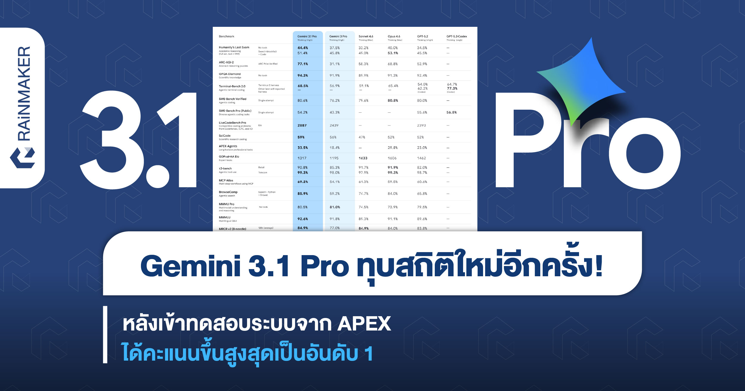 จากผลการทดสอบระบบ AI ของ APEX ได้อัปเดตมาว่า Gemini 3.1 Pro ของ Google ขึ้นแท่น ‘อันดับ 1’ ด้านประสิทธิภาพการทำงานของ AI ที่โดดเด่นทั้งเรื่องความรวดเร็วและความแม่นยำของข้อมูล