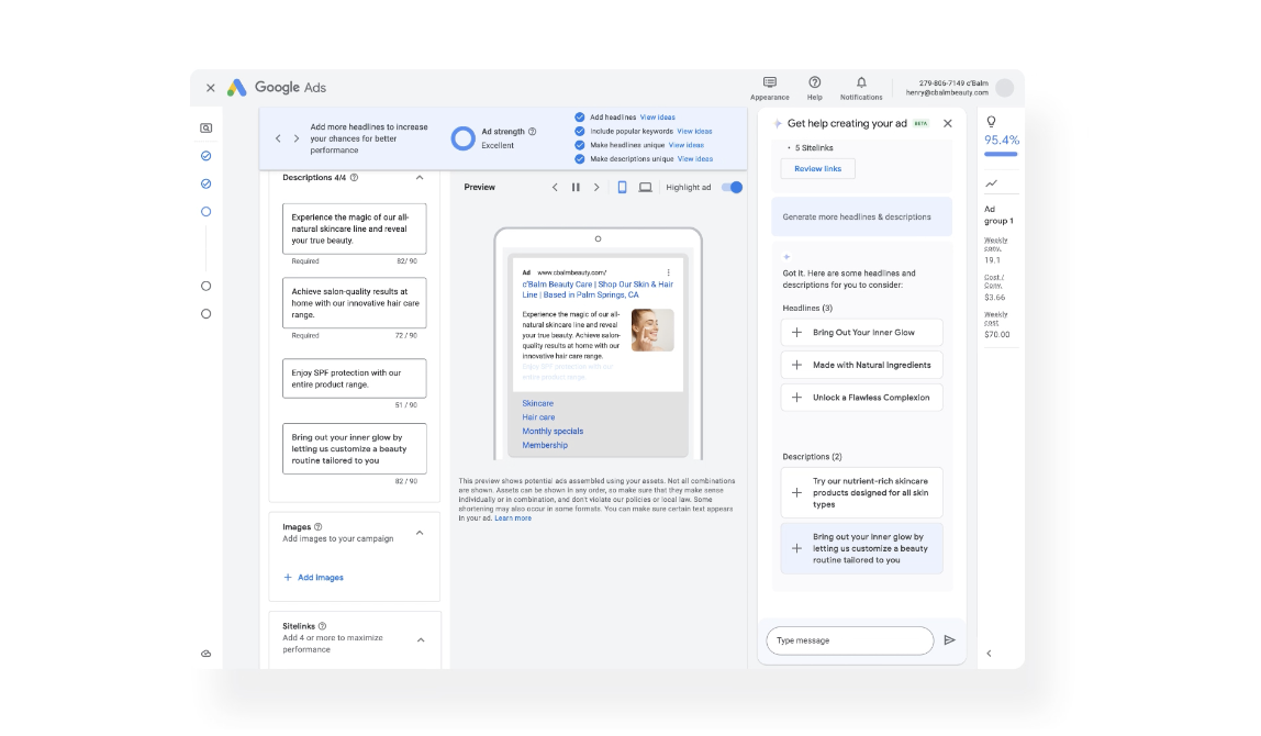 ก่อนหน้านี้ Google ได้ลองทดสอบฟีเจอร์ Conversational Experience กับนักโฆษณากลุ่มเล็ก ๆ ไปเมื่อไม่กี่เดือนก่อน และค้นพบว่าฟีเจอร์ดังกล่าวสามารถช่วยให้คุณภาพของ Search Campaign ดีขึ้นและช่วยลดความยุ่งยากลง ซึ่งตัวชี้วัดผลที่ใช้คือเรื่องของ Ad Strength ตามมาตรฐานของ Google Ads ไม่ว่าจะเป็น ความเกี่ยวข้อง, คุณภาพ และความหลากหลายของ Copy โฆษณา และจากนั้นก็ให้คะแนนตั้งแต่ “แย่ (Poor)” ไปจนถึง “ยอดเยี่ยม (Excellent)”