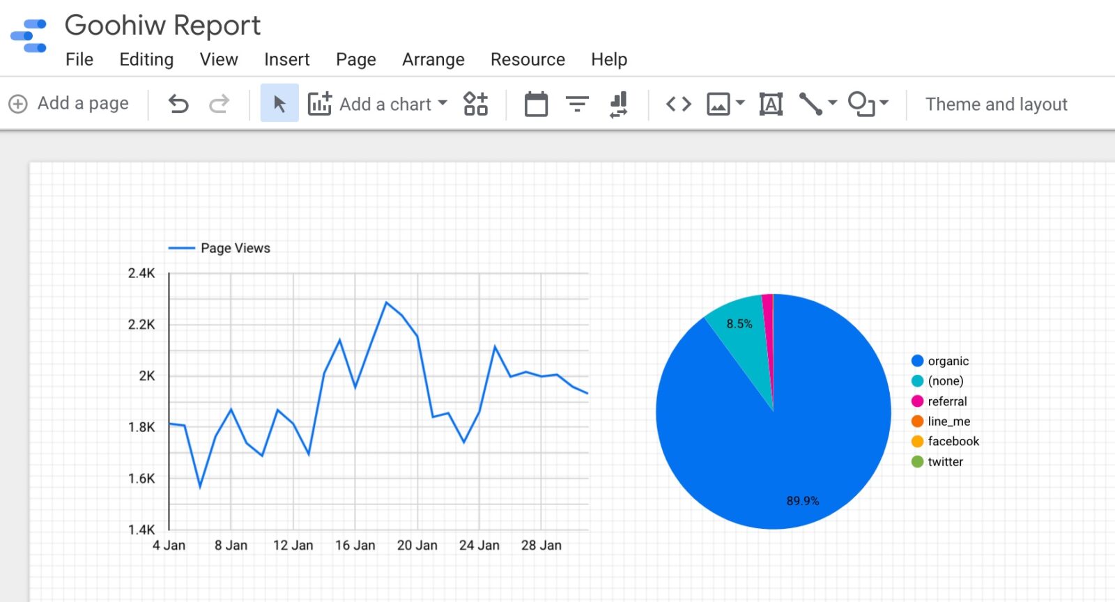 ตัวอย่างจากภาพด้านบน ผมนำ Time series ที่ดึง field ตัวเลข Page views ในหนึ่งเดือนมาวาง และ Pie chart แสดงที่มาของผู้ชมเว็บไซต์ ทั้งหมดนี้แค่ลากวางเท่านั้น ทำง่ายมาก