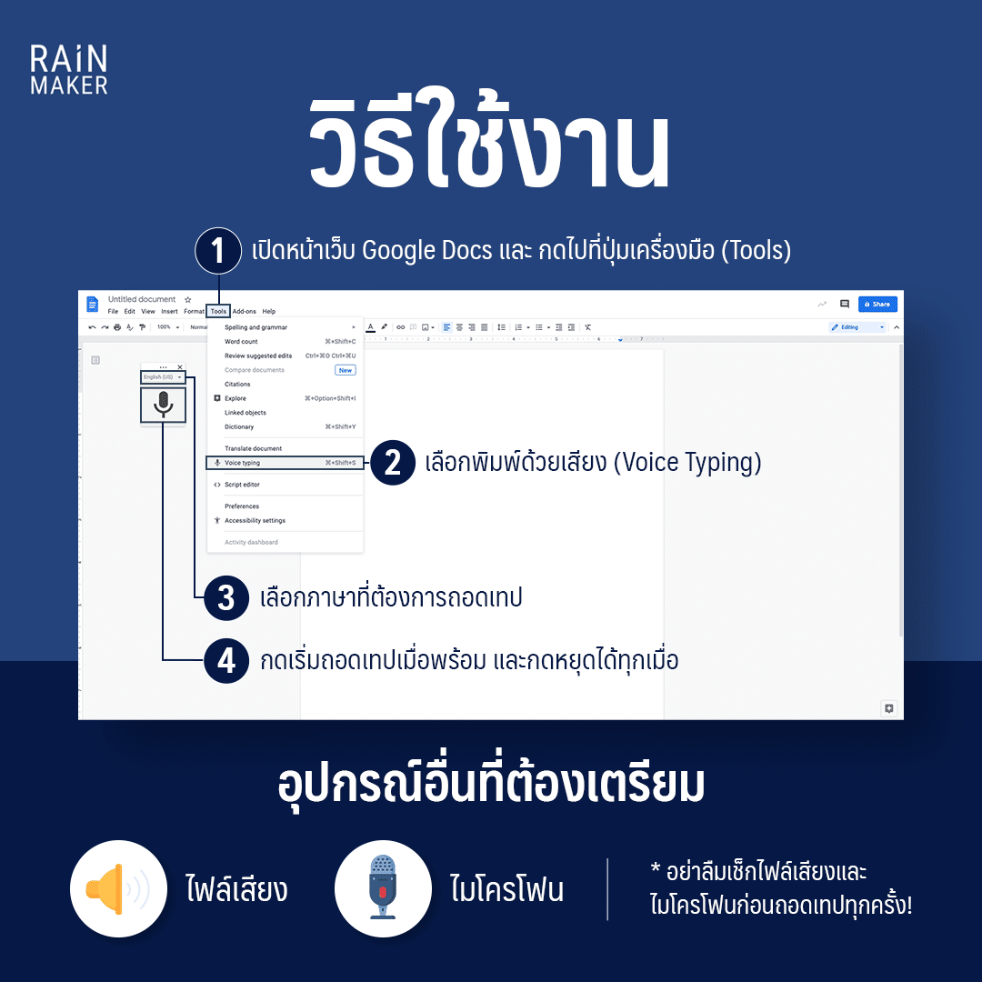 หลายคนอาจยังไม่รู้ว่าเจ้า Google Docs สามารถช่วยถอดไฟล์เสียงให้เป็นตัวหนังสือได้ โดยมีเครื่องมือที่ชื่อว่า “พิมพ์ด้วยเสียง” ที่สามารถช่วยถอดเสียงจากไฟล์เสียง หรือคลิปวิดีโอออกมาเป็นตัวหนังสือให้เรียบร้อย ใครไม่รู้จักโปรแกรมอื่น หรือไม่อยากติดตั้งลงเครื่องให้ยุ่งยาก Google Docs นับเป็นอีกโปรแกรมช่วยถอดไฟล์เสียงที่แนะนำเลย