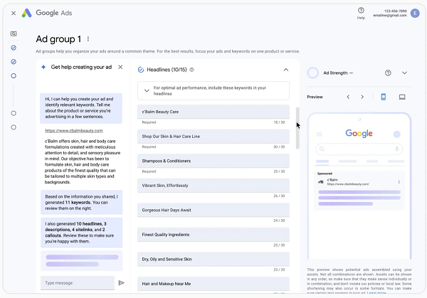 นอกจากนี้ Google ยังปล่อยฟีเเจอร์ใหม่ที่ใช้ Google AI ในการช่วยสรุปจากหน้าเว็บไซต์ เพื่อสร้างคีย์เวิร์ด, ชื่อหัวข้อ, คำอธิบาย, ภาพ และ Asset อื่น ๆ ที่เกี่ยวข้องกับแคมเปญโฆษณา รวมถึงสามารถตรวจสอบและแก้ไขเพิ่มเติมได้ตามที่ต้องการ