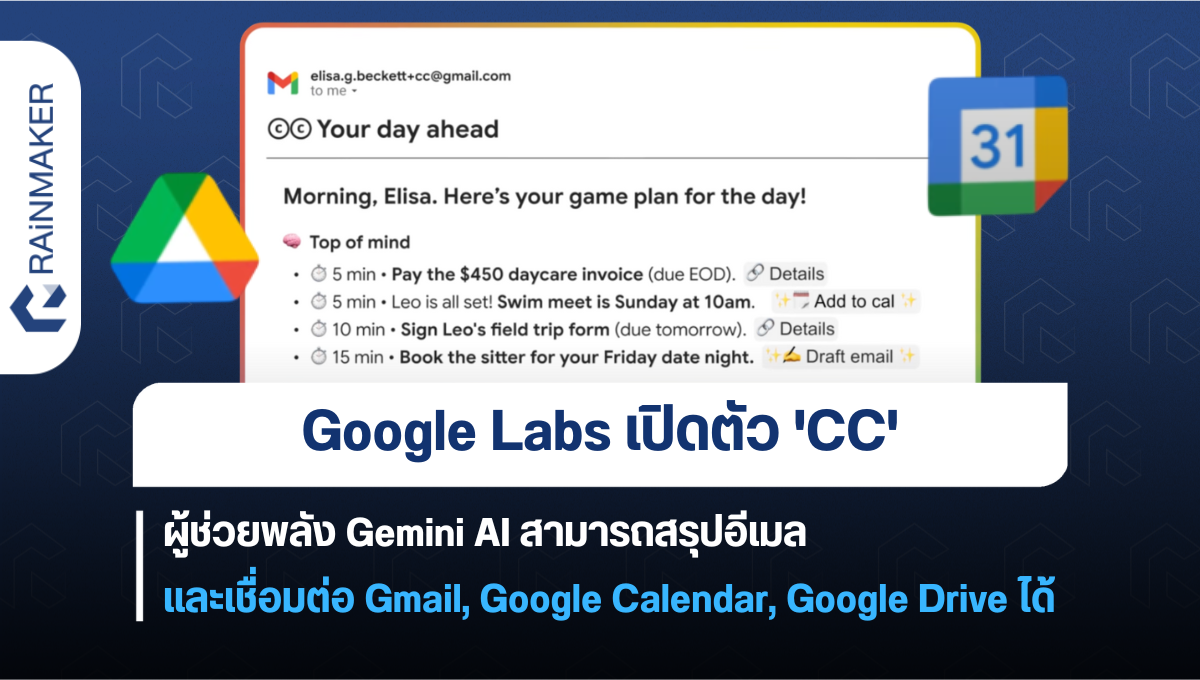 โดย CC คือ AI Productivity Agent โปรเจกต์การทดลองใหม่จาก Google Labs ที่สร้างขึ้นด้วย Gemini ที่จะทำให้การจัดระบบการทำงานให้เสร็จได้เร็วขึ้น เพราะเมื่อลงทะเบียนแล้วจะเชื่อมต่อกับ Gmail, Google Calendar, Google Drive และเว็บไซต์ต่าง ๆ ที่เกี่ยวข้อง เพื่อทำความเข้าใจชีวิตประจำวันของผู้ใช้