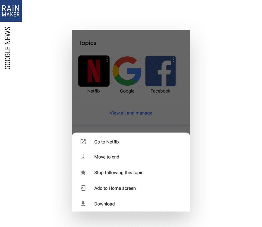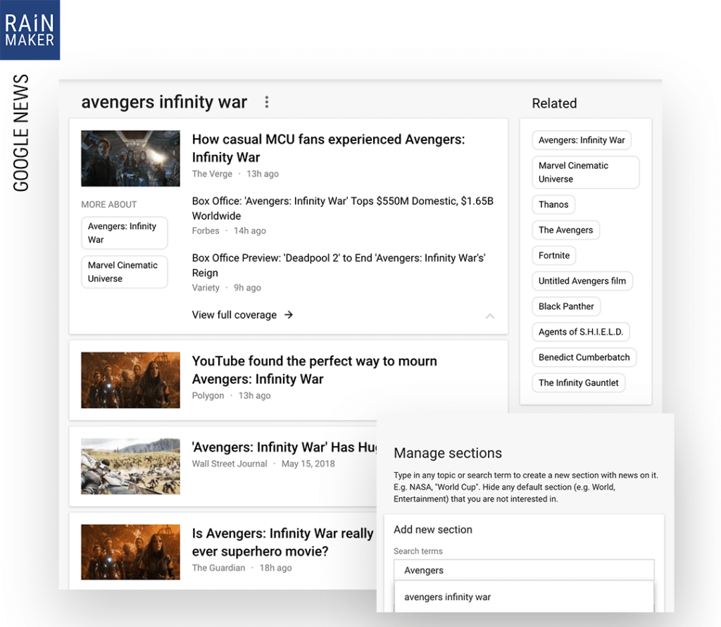 news.google.com ไปที่ Manage sections เพิ่มหมวดข่าวใหม่ โดยใช้คีย์เวิร์ด Google มันจะรวบรวมข่าวเรื่องนั้นม