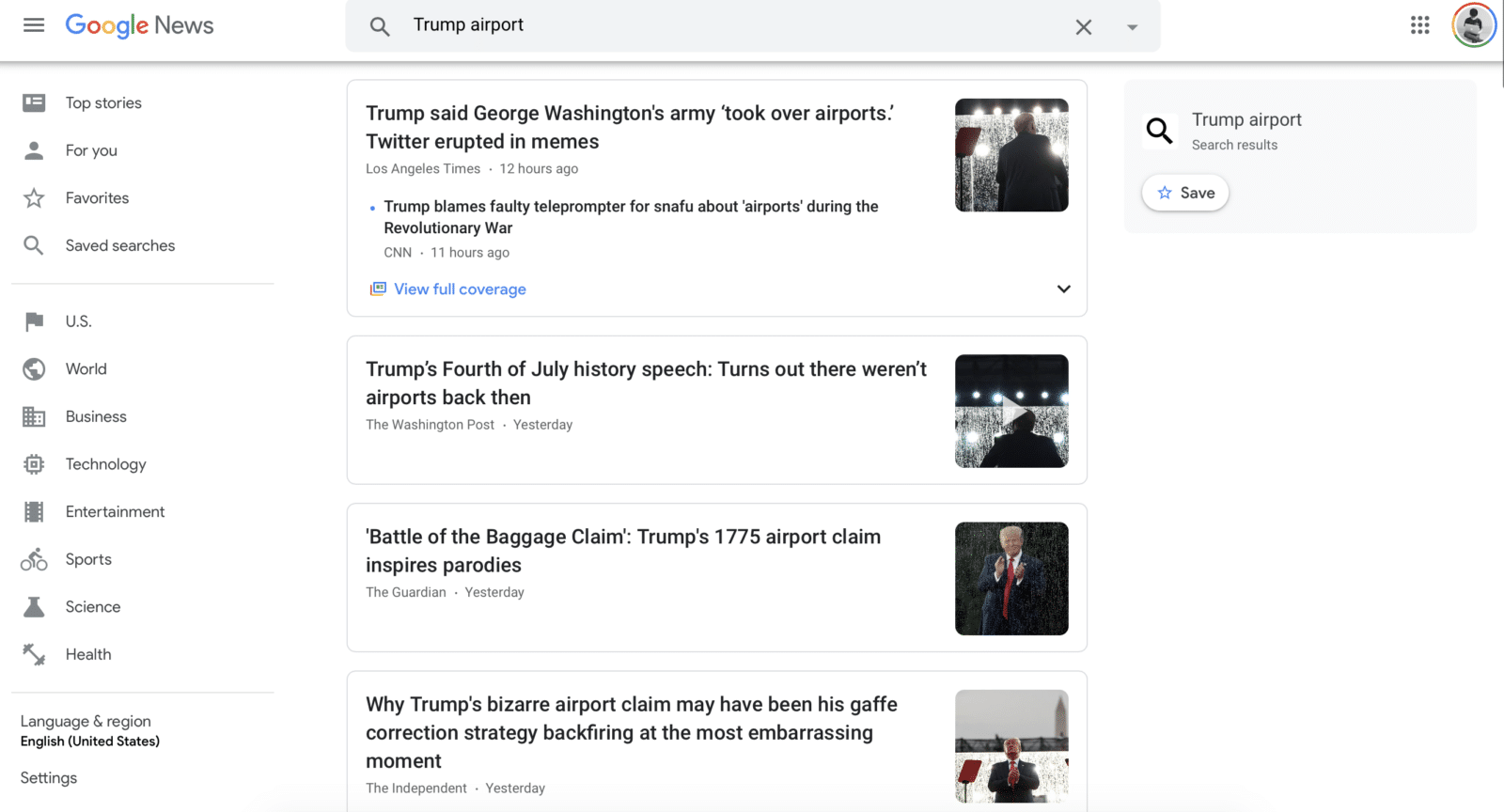 ฟีเจอร์ที่เราจะมาลองเล่นกันวันนี้ก็คือ View Full Coverage หรือการดูรายงานสถานการนั้น ๆ ซึ่งหน้าเว็บ Google News ก็จะแปลงร่างกายเป็นเว็บเกาะติดสถานการนั้น ๆ โดยทันที โดยเราจะมาลองดูข่าวที่เป็นประเด็นในวันที่เขียนบทความนี้ก็คือ กรณีที่ Trump พูดว่าในสงครามกลางเมืองอเมริกันที่นำไปสู่วันชาติอเมริกันมีการยึดสนามบิน (สองร้อยกว่าปีที่แล้วยังไม่มีสนามบินเลย) ว่ามันมีที่มาที่ไปอย่างไร สำนักข่าวไหนพูดถึงบ้าง คนบน Social Media คิดเห็นอย่างไร
