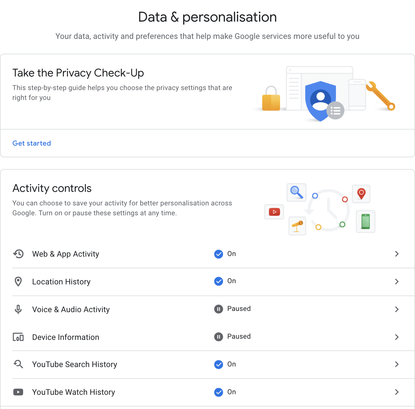 ในส่วนของข้อมูลที่ track จาก activity ตั้งแต่การเข้าเว็บไซต์ การใช้แผนที่นำทาง ไปจนถึง history ต่างๆ ที่ทำผ่าน Google Service จะถูกเก็บไว้ทั้งหมด โดยเราสามารถเข้าไปดูได้ว่าเปิดให้ Google เก็บอะไรไปบ้างที่หน้า Data & personalisation