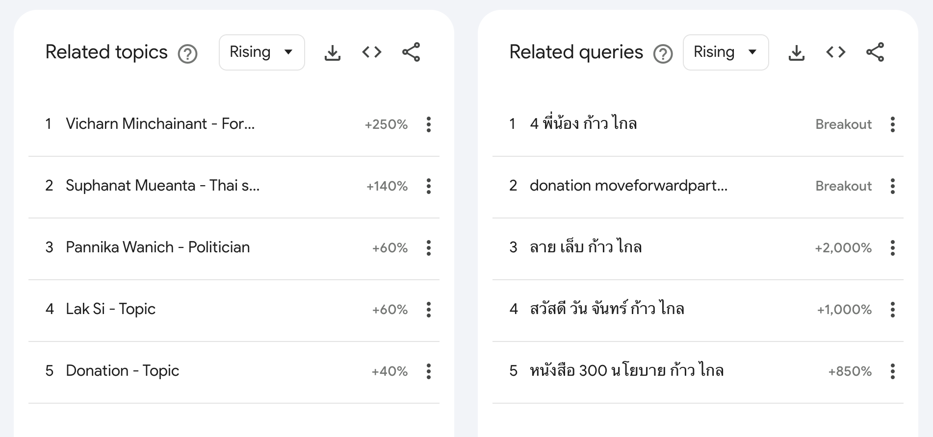 และหลังจากเลือก Explore เพิ่มเติม ก็สามารถเลือกพรรคการเมืองที่อยากดูสถิติ ประเทศ ช่วงเวลาในการอัปเดต และรูปแบบการเสิร์ช เช่น รูปภาพ ข่าวสาร หรือการเสิร์ชจาก YouTube ได้เช่นกัน และยังมีการค้นหาหัวข้อที่เกี่ยวข้องกันด้วยนะ