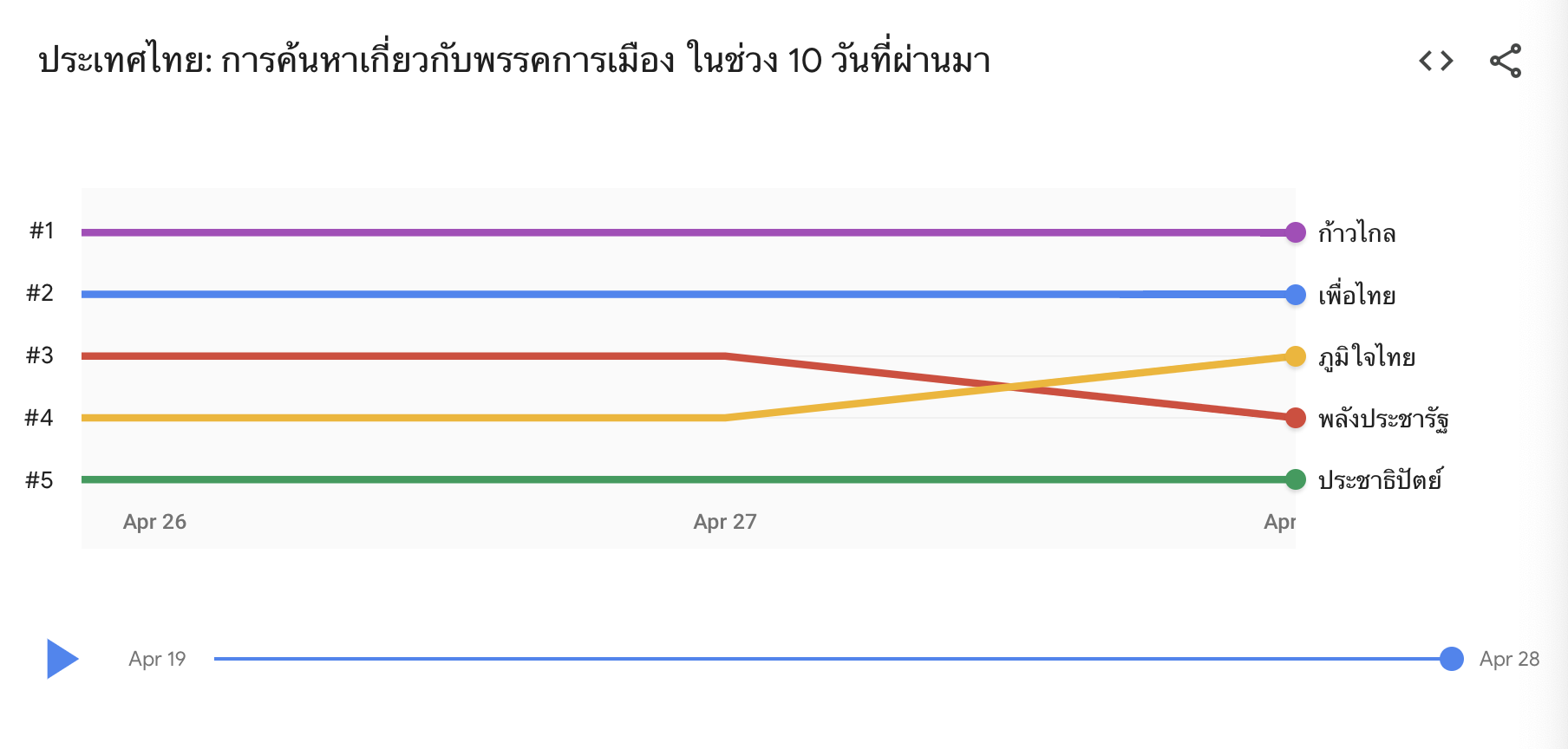 โดยเริ่มจากเซสชัน “การค้นหาแบ่งตามพรรคการเมืองของไทย” จะอัปเดตพรรคการเมืองที่มียอดการค้นหามากที่สุด โดยเรียงลำดับเป็นเปอร์เซ็นต์จากมากไปหาน้อย และสามารถกด “Explore” ต่อ เพื่อดูสถิติ เปรียบเทียบกันแต่ละพรรคได้ แถมทุกบอร์ดยังสามารถแชร์ไปลงโซเชียลมีเดียอย่าง Facebook, Twitter, LinkedIn, Tumblr ด้วย