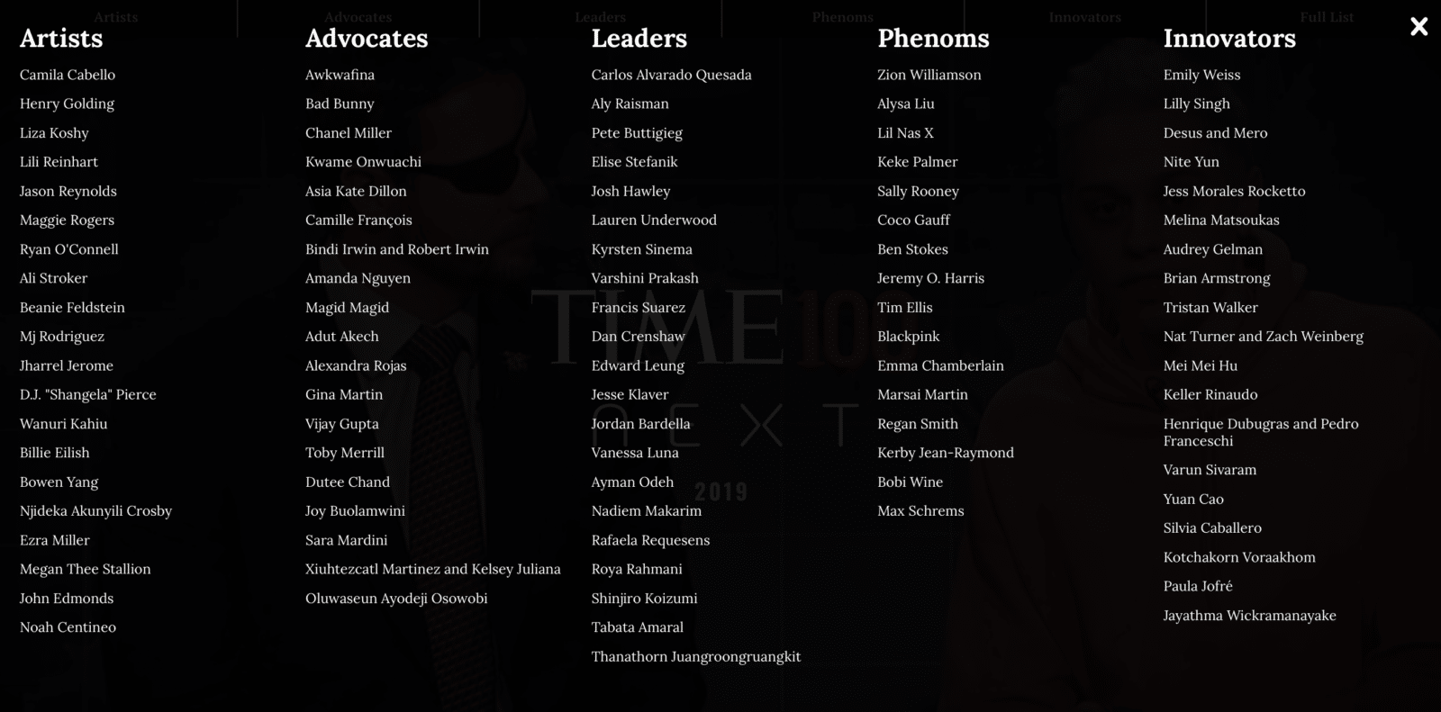 ดังนั้นย้อนกลับไปตอนแรกที่ Felsenthal บอกว่านิยามของการมีอิทธิพลเปลี่ยนไป แน่นอนว่า TIME 100 เดิมก็ยังมีอยู่ แต่ TIME 100 NEXT เป็นอีกหนึ่งหัวข้อที่เพิ่มขึ้นมาและโฟกัสไปยังกลุ่มคนที่มีวิธีการที่น่าทึ่งในการก้าวเข้ามามีอิทธิพลก็คือเอาผู้มีอิทธิพลนั่นแหละ รวมถึงจาก TIME 100 เองด้วยที่เคยได้ มาช่วยกันคัดเลือกโดยมุมมองของผู้มีอิทธิลพอีกที (เป็นวิธีการเลือกที่ฉลาดมาก)