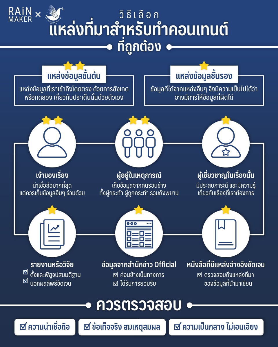การเขียนคอนเทนต์นั้นอาจดูเหมือนง่าย แท้จริงแล้วเป็นเรื่องค่อนข้างละเอียดอ่อน เพราะเป็นการถ่ายทอดเรื่องราวไปให้ผู้อื่น ดังนั้นสิ่งที่สำคัญที่สุด คือแหล่งข้อมูลที่นำมาเขียนและอ้างอิงที่น่าเชื่อถือ เพื่อให้ผู้อ่านได้รับข่าวสารที่ถูกต้อง