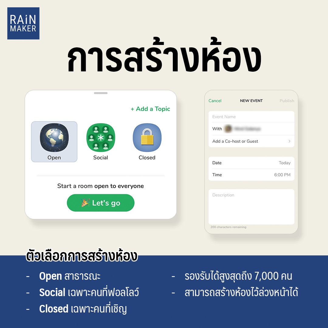 นอกจากนี้ยังสามารถสร้างห้องไว้ล่วงหน้าได้อีกด้วย โดยการตั้งเวลา ใส่ชื่อท็อปปิก เชิญสปีกเกอร์ และใส่คำอธิบายสั้นๆ เกี่ยวกับห้อง