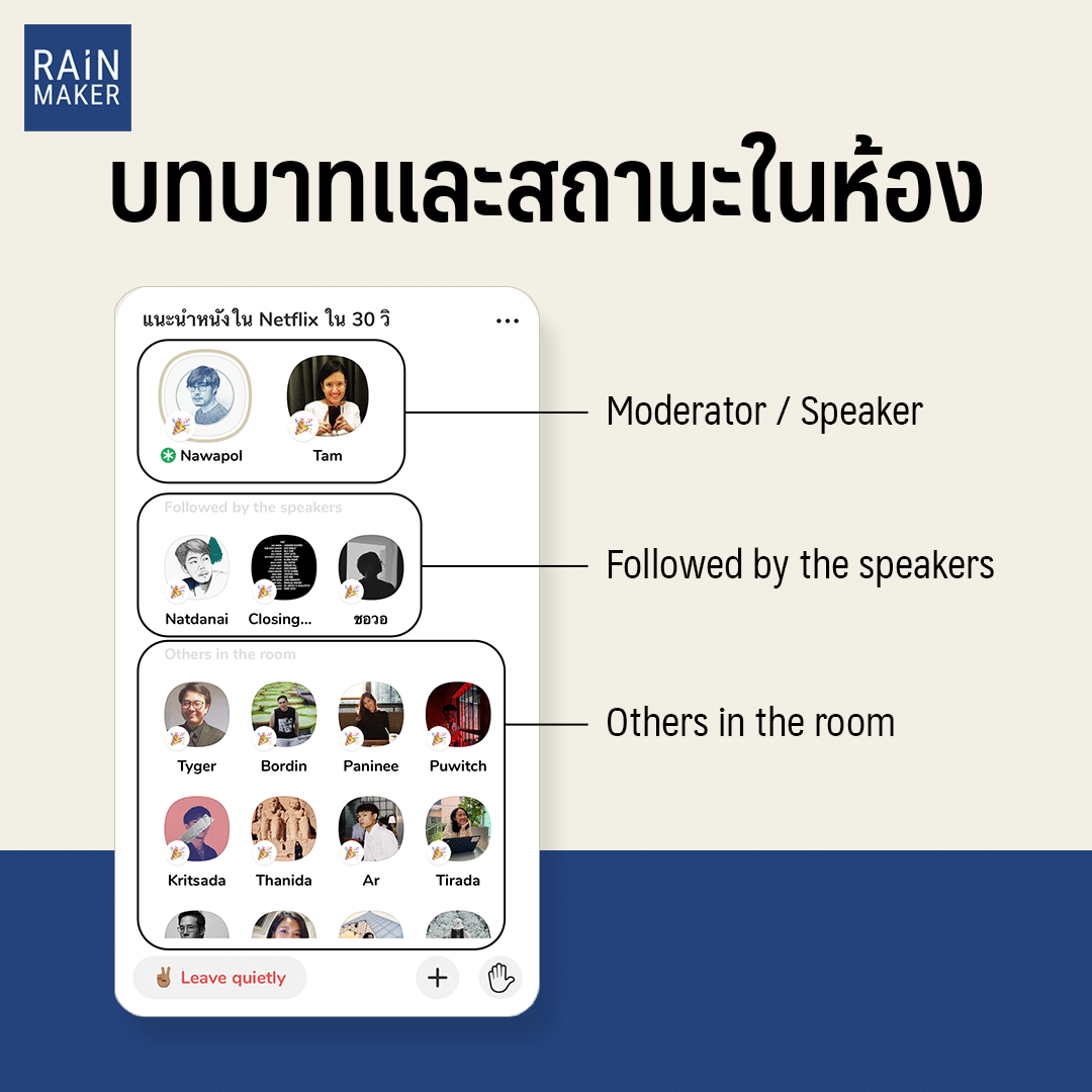 ส่วนแรกเป็นส่วนของ Moderator และ Speaker เปรียบเสมือนหน้าเวทีนั่นเอง Moderator คือ คนสร้างห้อง จะมีสัญลักษณ์ดอกจันสีเขียวอยู่ที่หน้าชื่อ สามารถเลือกว่าจะให้ใครขึ้นมาเป็นสปีกเกอร์ หรือจะปลดใครออกจากการเป็นสปีกเกอร์ก็ได้