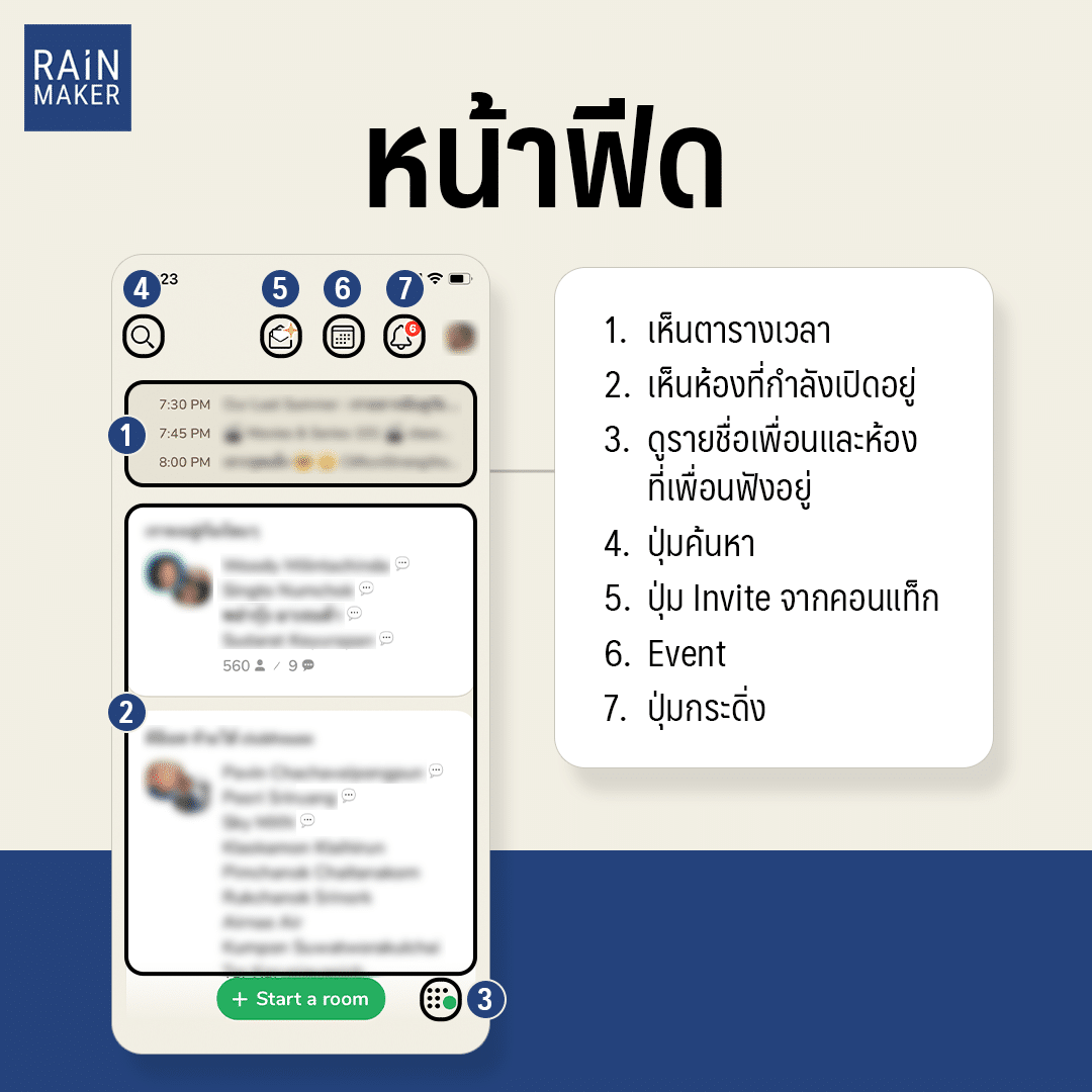 โดยจะเป็นห้องที่สร้างขึ้นจากคนที่เราติดตาม หรือเป็นห้องที่เพื่อนของเราเข้าไปฟังอยู่ รวมไปถึงแนะนำมาจากสิ่งที่เราสนใจ