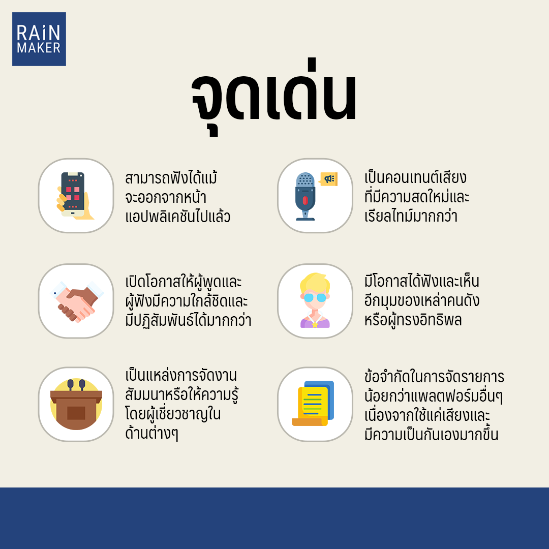 - เป็นคอนเทนต์เสียงที่มีความสดใหม่และเรียลไทม์มากกว่า