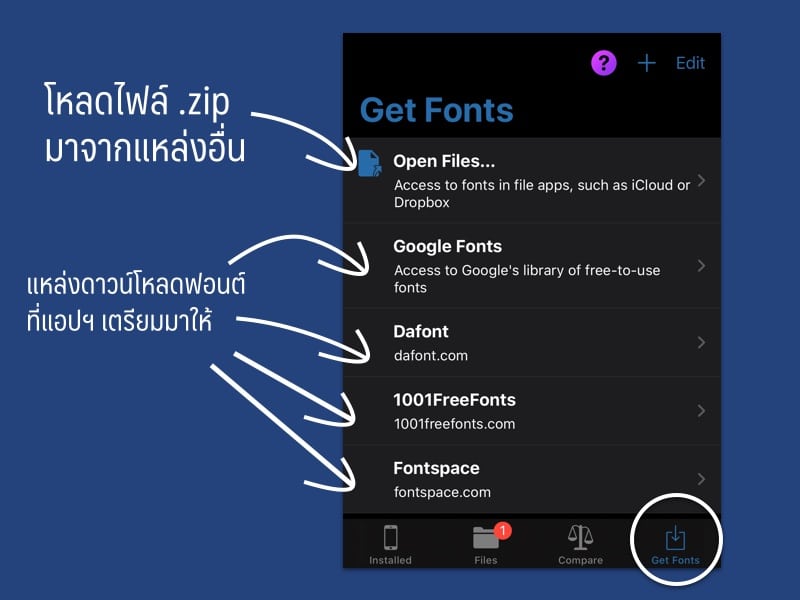 เข้าแอปฯ iFont ไปที่เมนู Get Fonts ที่มุมขวาล่าง โดยเบื้องต้นเราสามารถดาวน์โหลดได้สองแบบคือ จากแหล่งดาวน์โหลดภายนอก เช่น F0nt.com หรือ Thaifaces.com และจากแหล่งดาวน์โหลดฟอนต์มาตรฐานที่ใช้กันทั่วโลก เช่น Google Fonts, Dafont ในตัวอย่างนี้จะดาวน์โหลดฟอนต์ภาษาไทยมาจาก Google Fonts ครับ