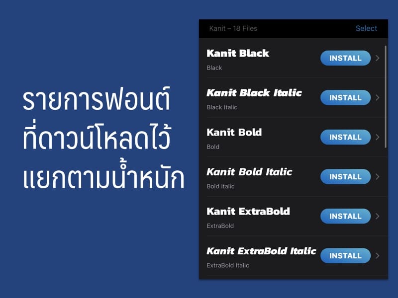 หลังจากดาวน์โหลดเสร็จเรียบร้อย เราจะพบรายการฟอนต์ที่เราโหลดมาแบบแยกน้ำหนัก ในแอปฯ iFont ให้กดปุ่ม install