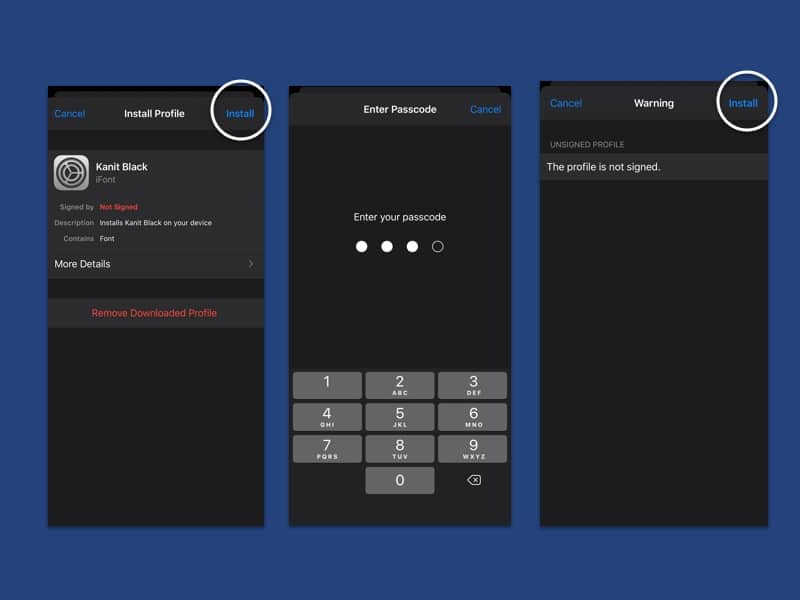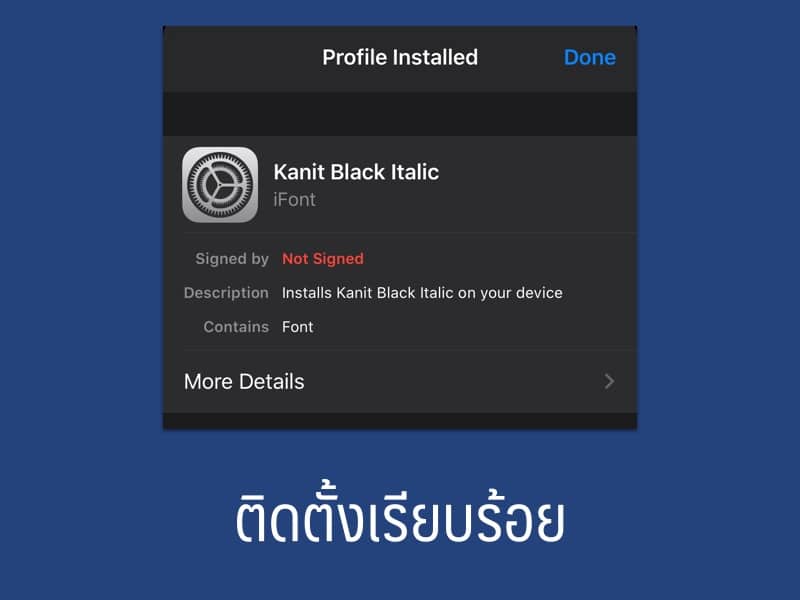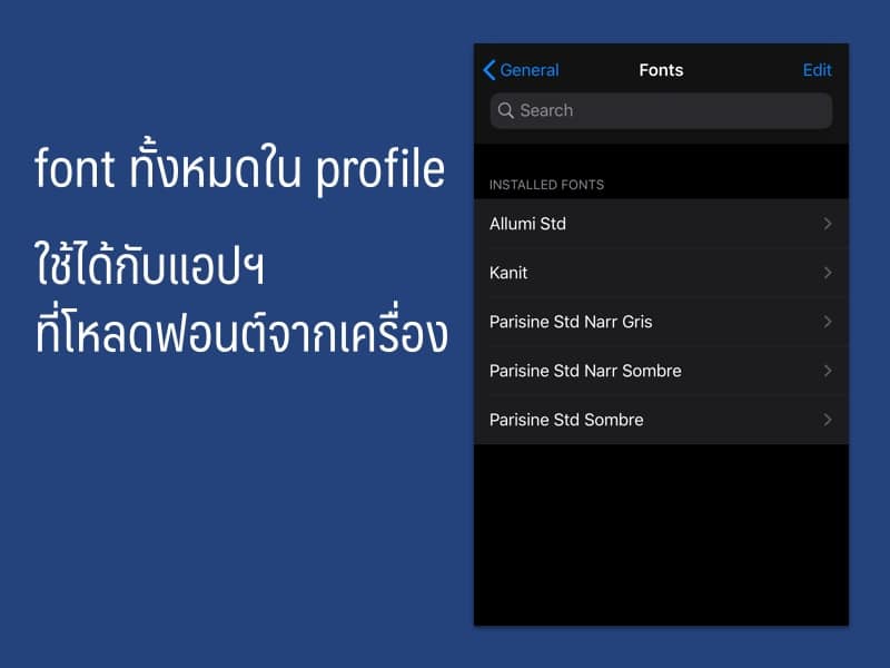 ซึ่งการติดตั้งที่เรากำลังจะทำนั้น จะเป็น profile ที่อยู่บนเครื่อง ทำให้ใช้งาน font ที่ติดตั้งเพิ่มได้ในแอปฯ ที่รองรับการเลือก font จาก profile นั่นเอง