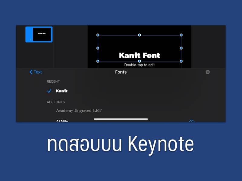 จากนั้นลองเข้าไปที่แอปฯ ที่รองรับการเลือกฟอนต์จากเครื่อง อย่าง Keynote หรือ Pages เป็นต้น ให้ลองเลือกข้อความจากนั้นลองเปลี่ยนเป็นฟอนต์ที่เราติดตั้งดูครับ เป็นอันเรียบร้อย