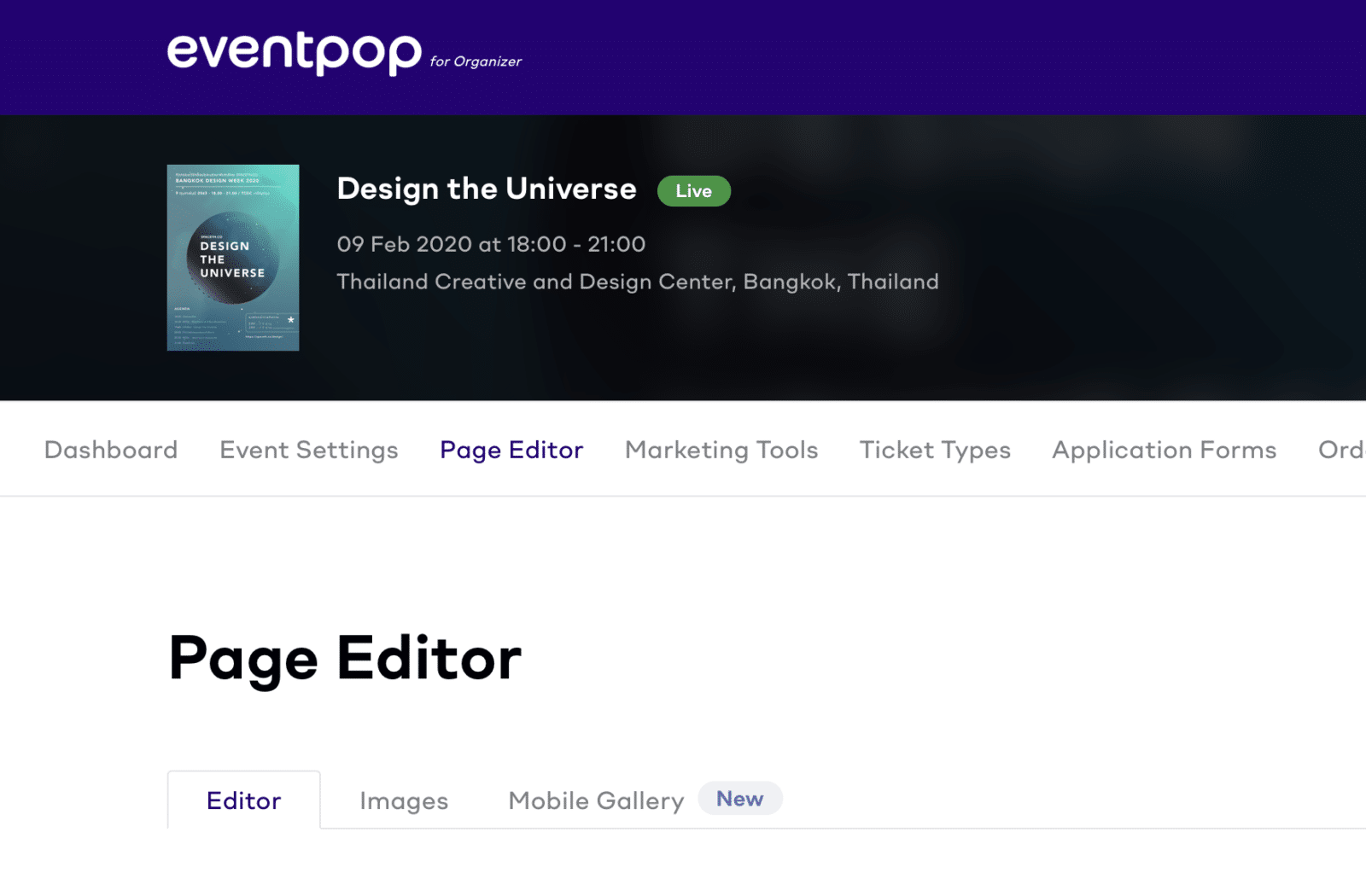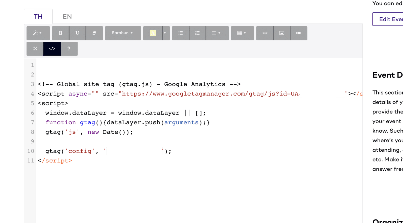 แต่วิธีการที่ทำได้ก็คือ ปกติในช่อง Page Editor ของ Eventpop ซึ่งให้เราใส่ข้อมูลที่เกี่ยวกับงานนั้น รับการแสดงผลแบบ HTML เต็มรูปแบบ (เราสามารถปรับแต่งในส่วนนี้ได้ด้วยโค้ด) ทำให้เราสมารถส่ง JavaScript ของ Google Analytic ให้ไปรันในหน้า Event Page ของเราได้ โดยการนำโค้ด Google Analytic ไปวาง