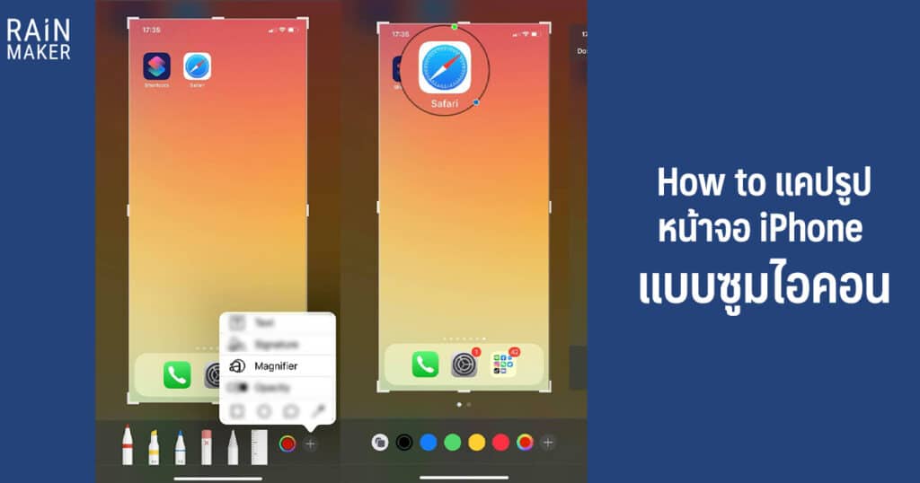 โดยขั้นแรกให้เรา “แคป” หน้าจอส่วนที่เราต้องการ > จากนั้นแตะที่รูปหลังแคปหน้าจอ > หลังจากนั้นกดเครื่องหมาย (+) แล้วจะมีเมนูขึ้นมาให้เลือก > ให้เราเลือกคำว่า “แว่นขยาย (Magnifier)” > เลื่อนวงแหวนไปส่วนที่เราต้องการขยายให้เด่น (จุดน้ำเงิน – ปรับขนาดวงแหวน, จุดเขียว – ปรับการซูม) > เมื่อได้ภาพที่ต้องการเเล้วก็ save ไปใช้งานได้เลยจ้า ^^