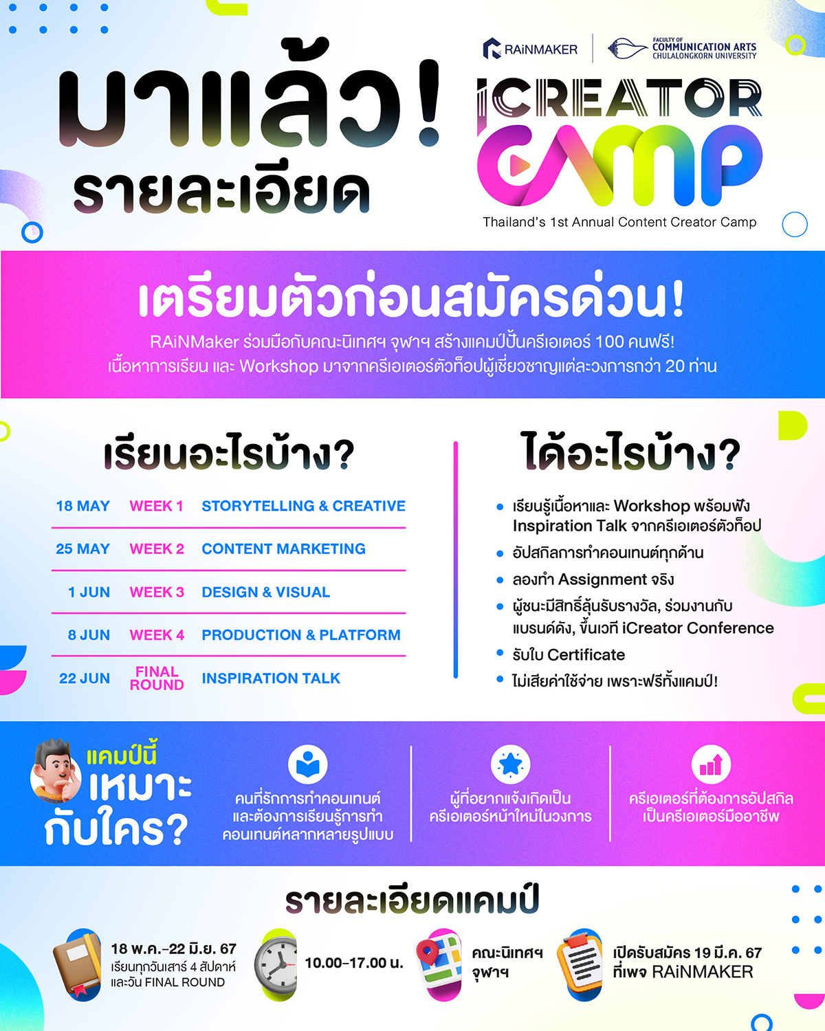 iCreator Camp 2024 เป็นโปรเจกต์ใหม่ในตระกูล iCreator ที่ RAiNMaker ร่วมมือกับคณะนิเทศศาสตร์ จุฬาลงกรณ์มหาวิทยาลัย ในการสร้างแคมป์ปั้นครีเอเตอร์ 100 คนฟรี! โดยทุกคนจะได้เข้ามาอัปสกิลการทำคอนเทนต์ และ Workshop กับครีเอเตอร์ตัวท็อปในวงการกว่า 20 ท่าน ที่ลงมือสอนเองเป็นเวลา 4 สัปดาห์