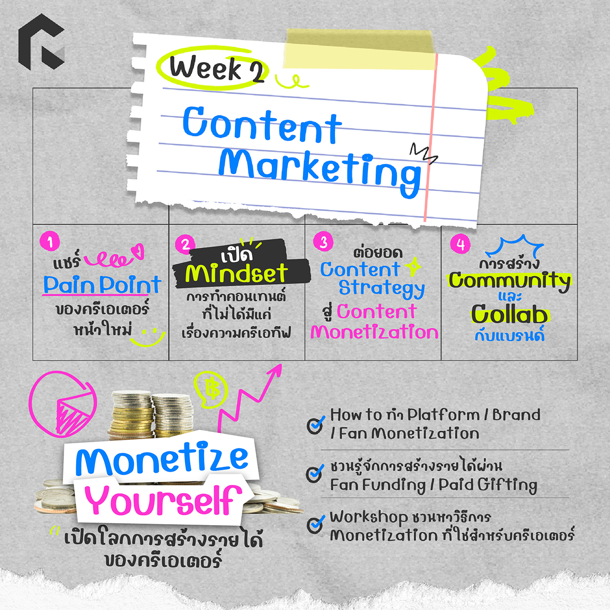 แก้ Pain Point ของครีเอเตอร์หน้าใหม่ ไม่ว่าจะเป็น เรื่องยอดวิวไม่ปัง หาช่องทางเติบโตอื่นไม่เจอ หรือไม่รู้จะเริ่มสร้างรายได้จากคอนเทนต์อย่างไร ด้วยการเริ่มต้นเข้าใจตัวเองผ่านการวางแผนการคอนเทนต์ที่มากกว่าครีเอทีฟ โดยการเปิดรับ Mindset ใหม่ ๆ ในการทำคอนเทนต์ พร้อมต่อยอดสู่การสร้าง Community และสร้างรายได้จากคอนเทนต์