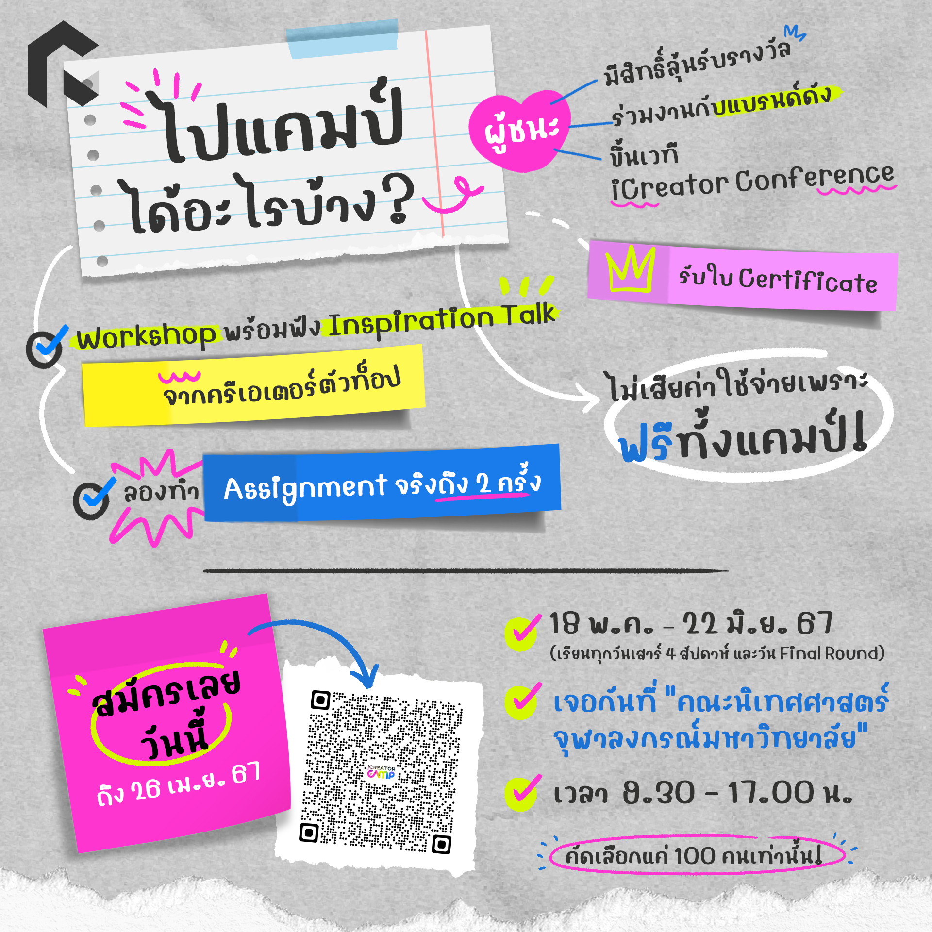 iCreator Camp 2024 Presented by SONY แคมป์ปั้นครีเอเตอร์ฟรี 100 คน! เพื่อเปิดโอกาสให้ทุกคนได้อัปสกิลเป็นครีเอเตอร์มืออาชีพ ผ่าน Workshop การทำคอนเทนต์รอบด้านจากครีเอเตอร์ชั้นนำของประเทศกว่า 20 ท่าน จัดเต็มตลอด 5 สัปดาห์