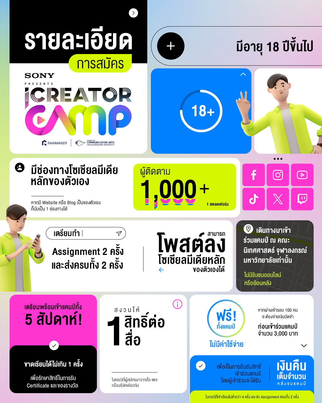 🎯 ผู้ผ่านการคัดเลือกทั้ง 100 คน ต้องสามารถเดินทางมาเข้าร่วมแคมป์ที่คณะนิเทศศาสตร์ จุฬาฯ ได้ในระหว่างวันที่ 18 พ.ค. – 22 มิ.ย. เนื่องจากไม่มีการรับชมออนไลน์หรือย้อนหลัง